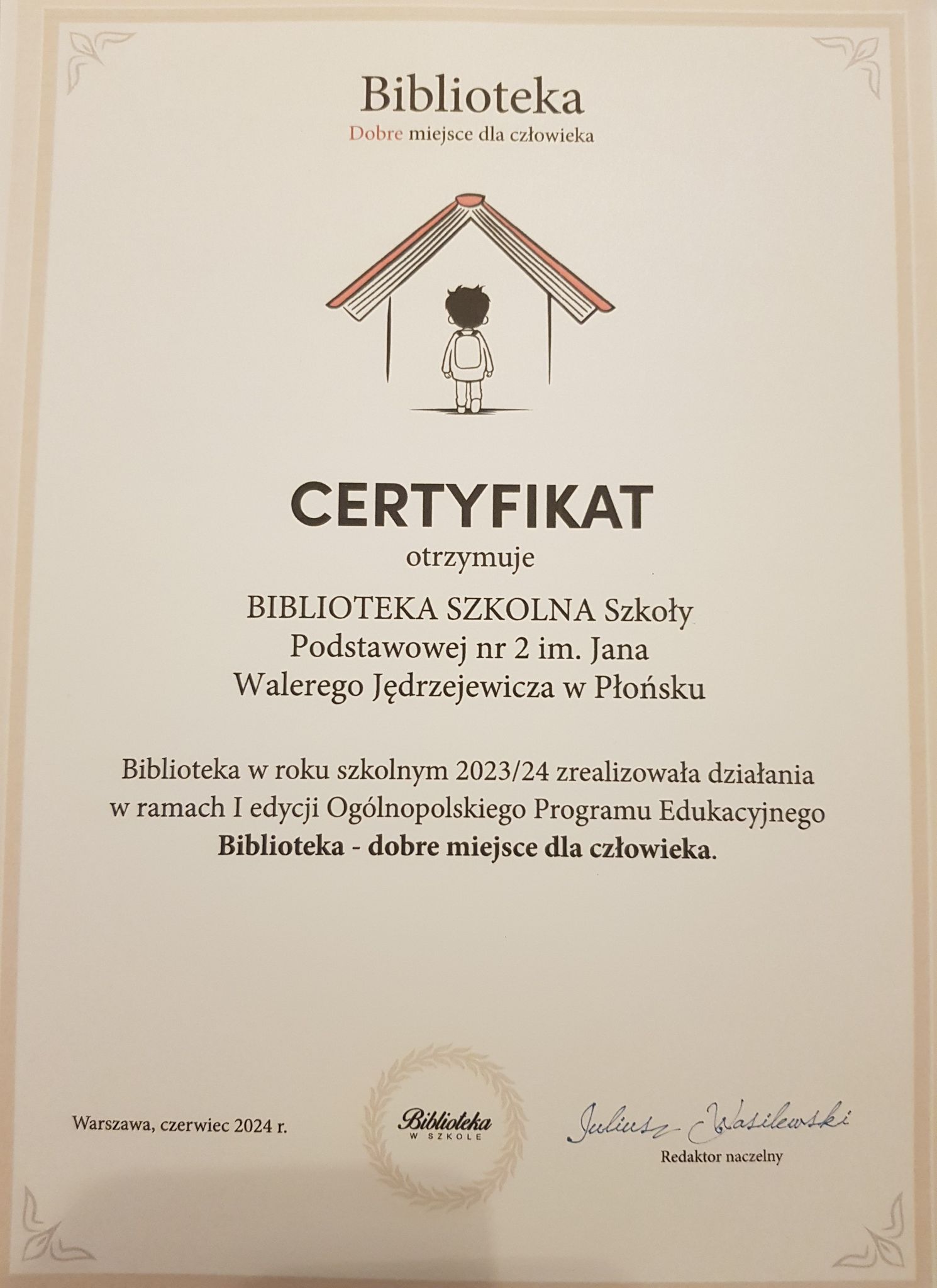 Biblioteka Szkoły Podstawowej nr 2 im. Jana Walerego Jędrzejewicza zaprasza wszystkich czytelników do udziału w II edycji Ogólnopolskiego Programu „BIBLIOTEKA – DOBRE MIEJSCE DLA CZŁOWIEKA”, którego pomysłodawcą i organizatorem jest miesięcznik „Biblioteka w szkole.” W roku szkolnym 2023/2024, pierwszą edycję ukończyło 370 bibliotek, a wśród nich również nasza biblioteka szkolna, za co otrzymaliśmy piękny certyfikat! Mamy nadzieję, że uczniowie SP2 również i w tym roku chętnie podejmą wyznaczone zadania. W ciągu roku szkolnego zaproponujemy od 4 do 5 działań promujących czytelnictwo.