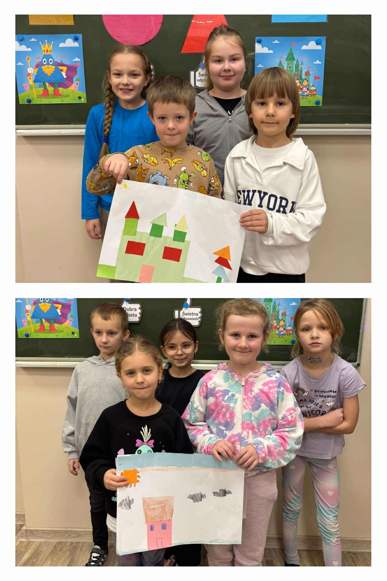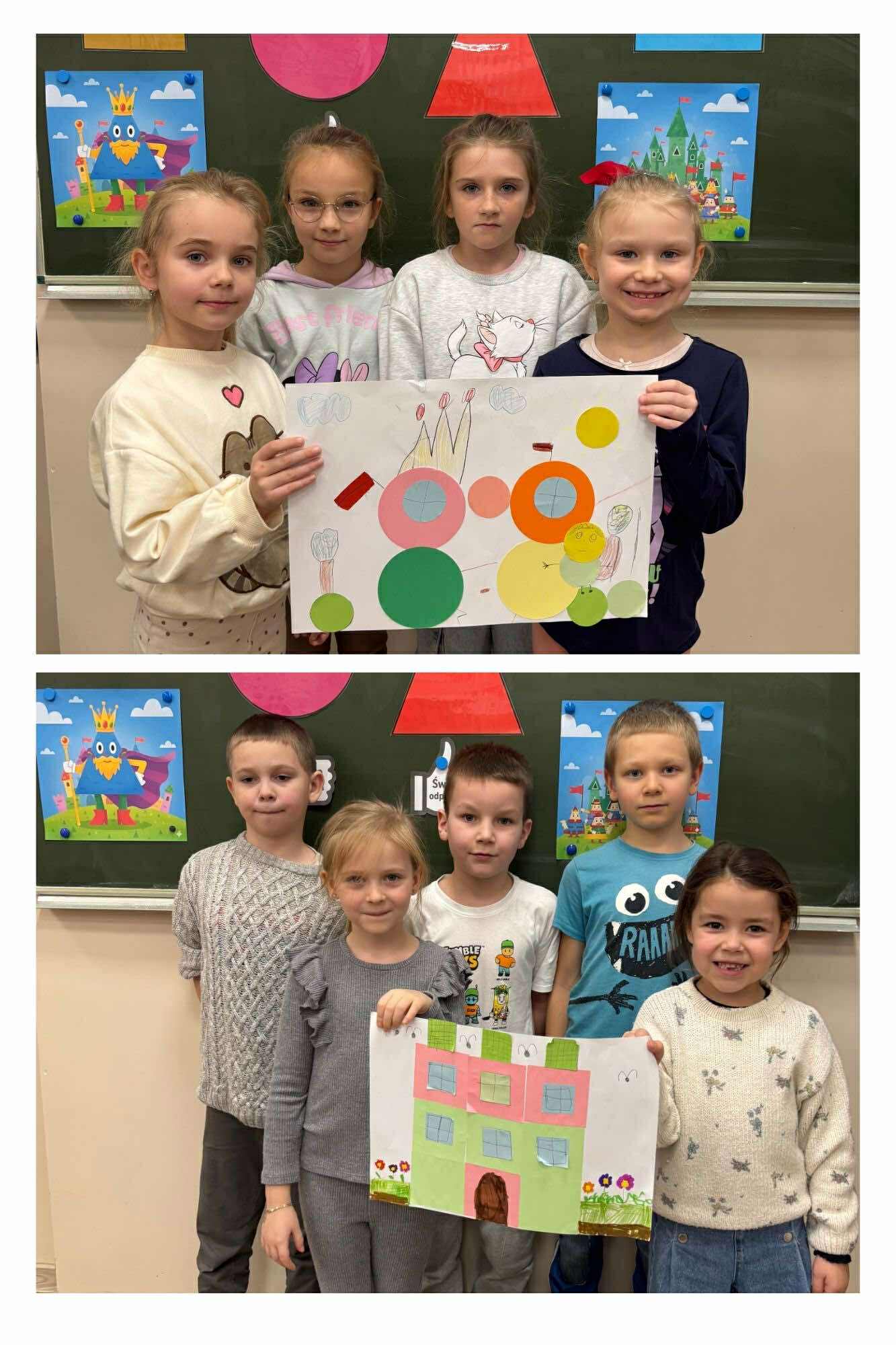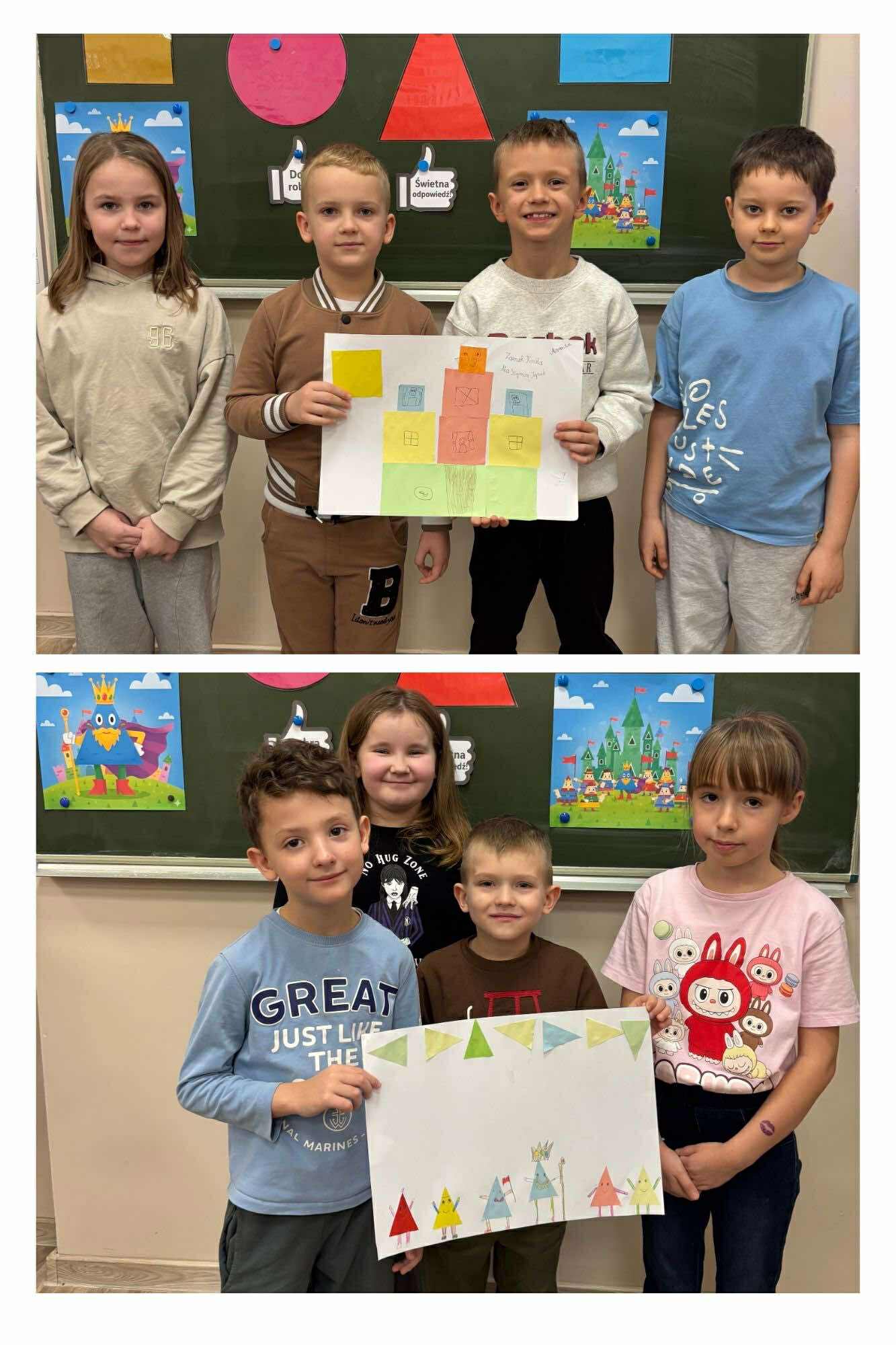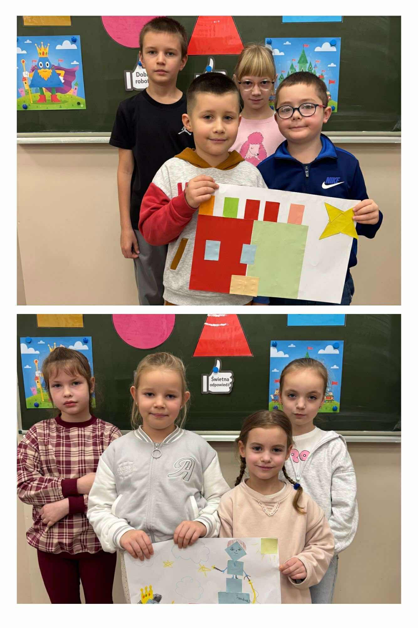 Nasi młodsi koledzy przenieśli się w zaczarowany świat wierszy, poznając historię z utworu „Trójkątna bajka”. Wspólnie odkrywaliśmy, jak wyglądała kraina figur oraz dlaczego wszystko w niej miało kształt trójkąta. Po wysłuchaniu bajki dzieci aktywnie odpowiadały na pytania, rozpoznawały figury geometryczne, dzieliły ich nazwy na sylaby oraz wyszukiwały je w sali. Nie zabrakło też zabaw interaktywnych, które sprawiły im mnóstwo radości. Na zakończenie starszaki wraz z uczniami klasy 2e wykonały kolorową pracę plastyczną pt. „Mój wyjątkowy świat”. Było twórczo, radośnie i pełno pozytywnej energii!
