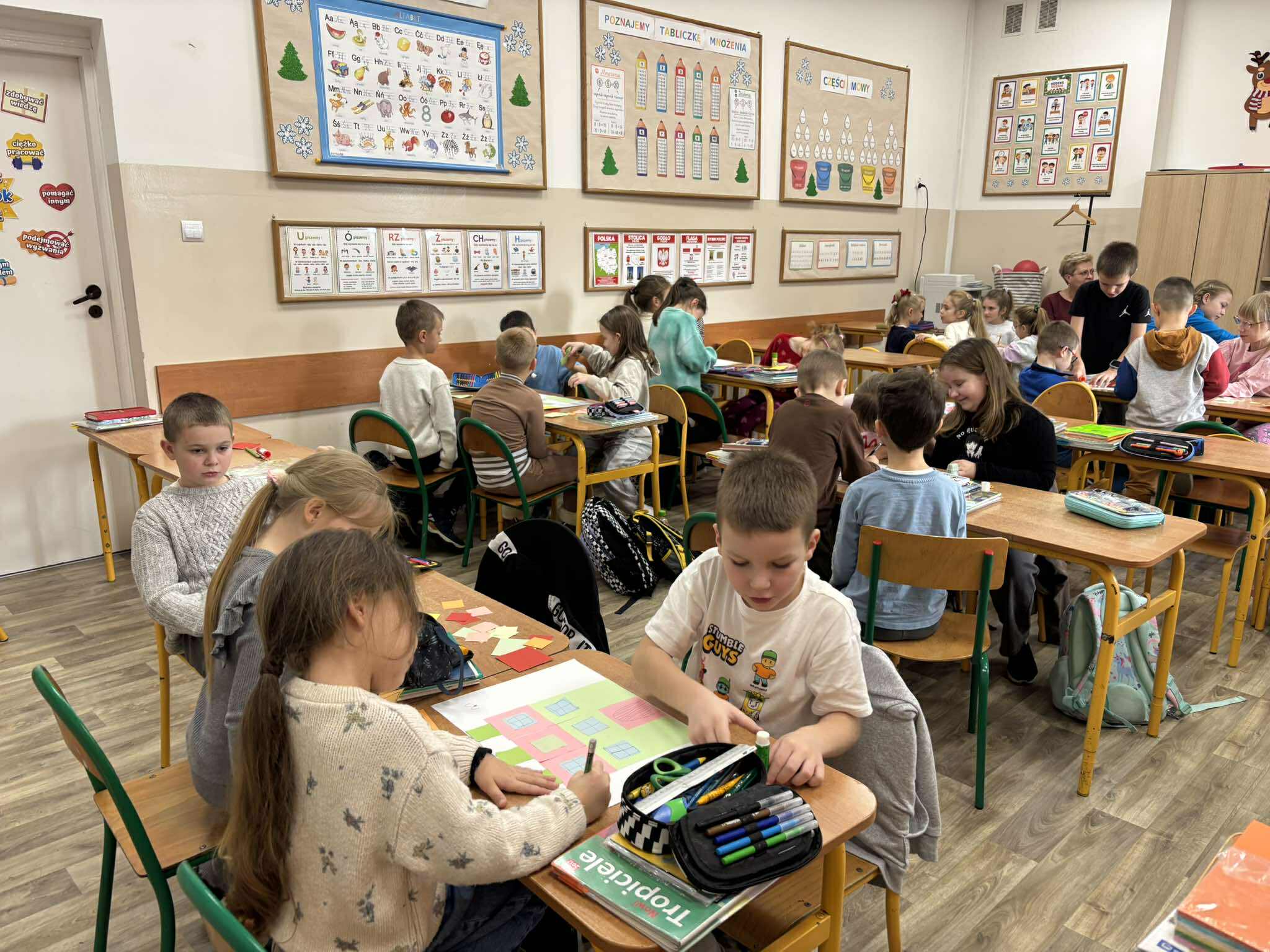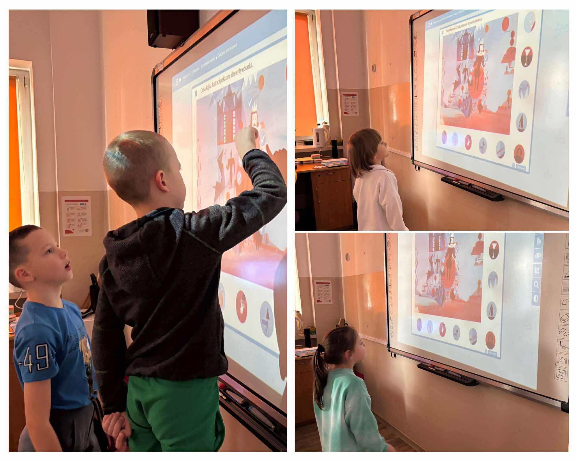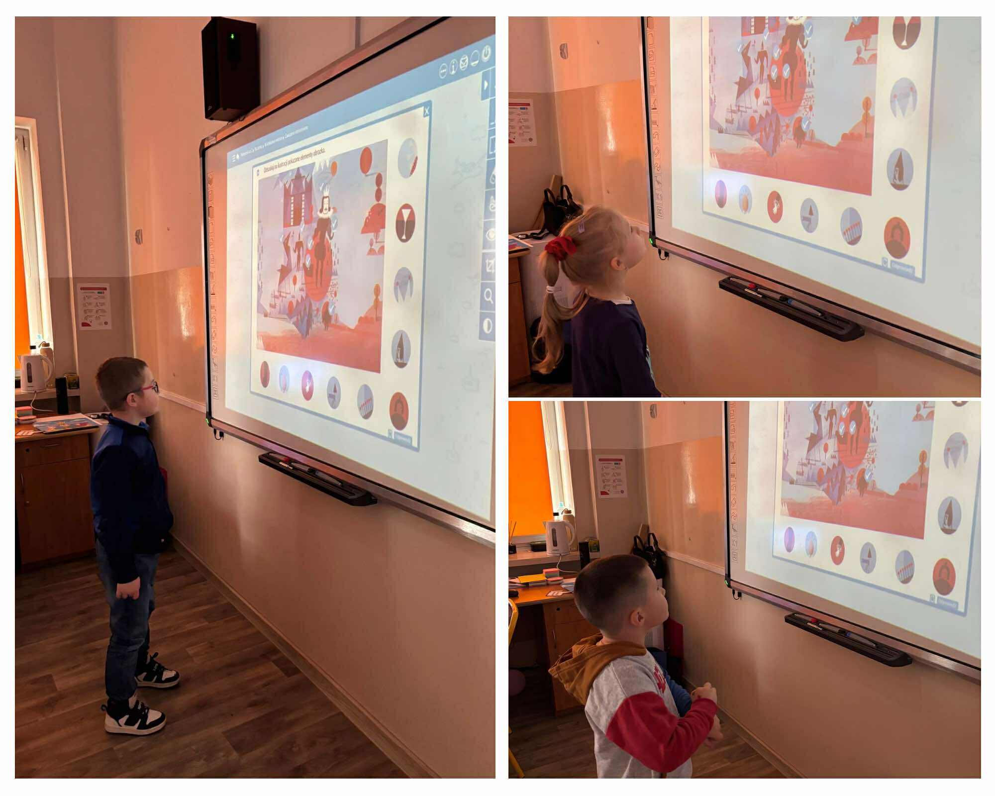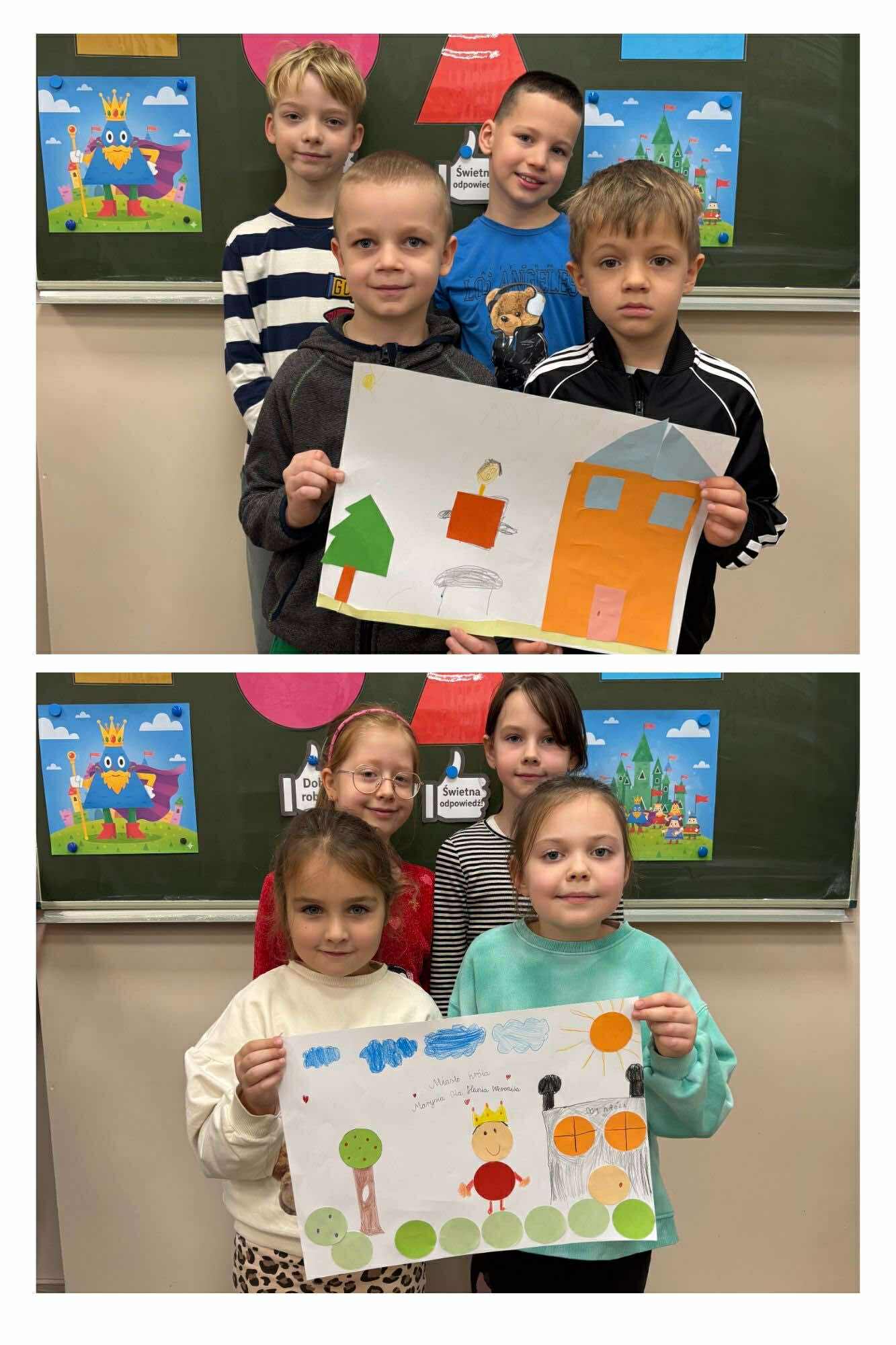 Nasi młodsi koledzy przenieśli się w zaczarowany świat wierszy, poznając historię z utworu „Trójkątna bajka”. Wspólnie odkrywaliśmy, jak wyglądała kraina figur oraz dlaczego wszystko w niej miało kształt trójkąta. Po wysłuchaniu bajki dzieci aktywnie odpowiadały na pytania, rozpoznawały figury geometryczne, dzieliły ich nazwy na sylaby oraz wyszukiwały je w sali. Nie zabrakło też zabaw interaktywnych, które sprawiły im mnóstwo radości. Na zakończenie starszaki wraz z uczniami klasy 2e wykonały kolorową pracę plastyczną pt. „Mój wyjątkowy świat”. Było twórczo, radośnie i pełno pozytywnej energii!