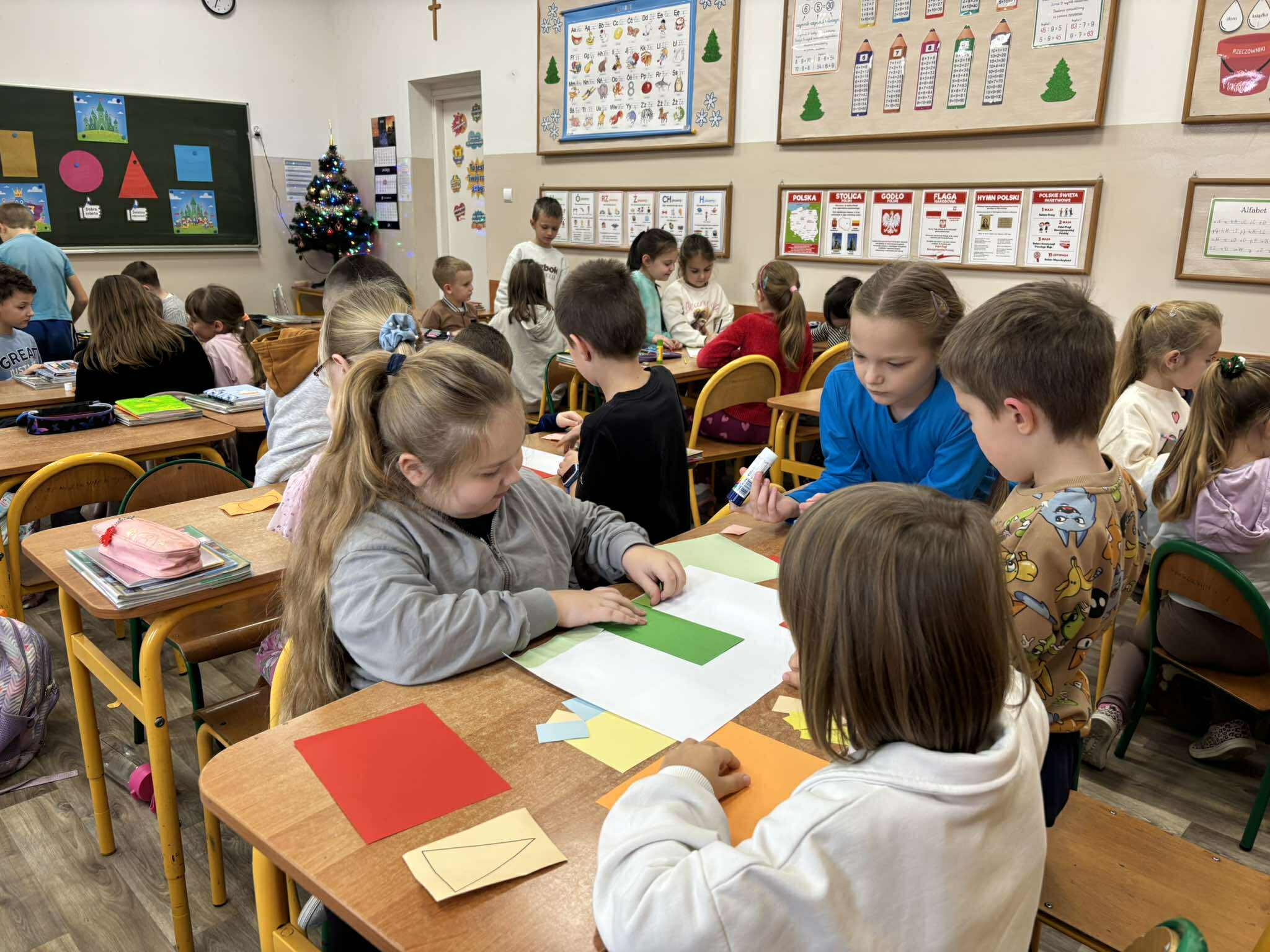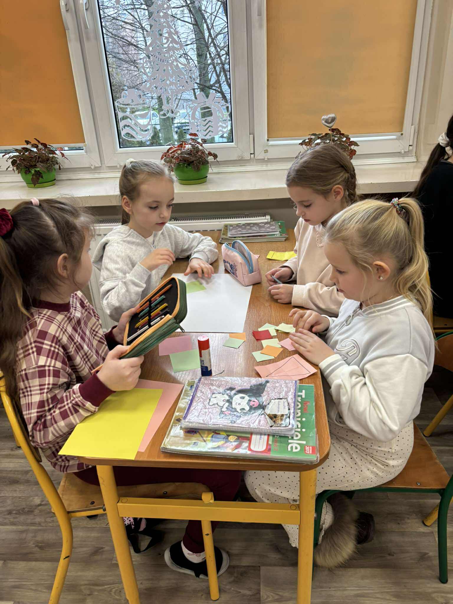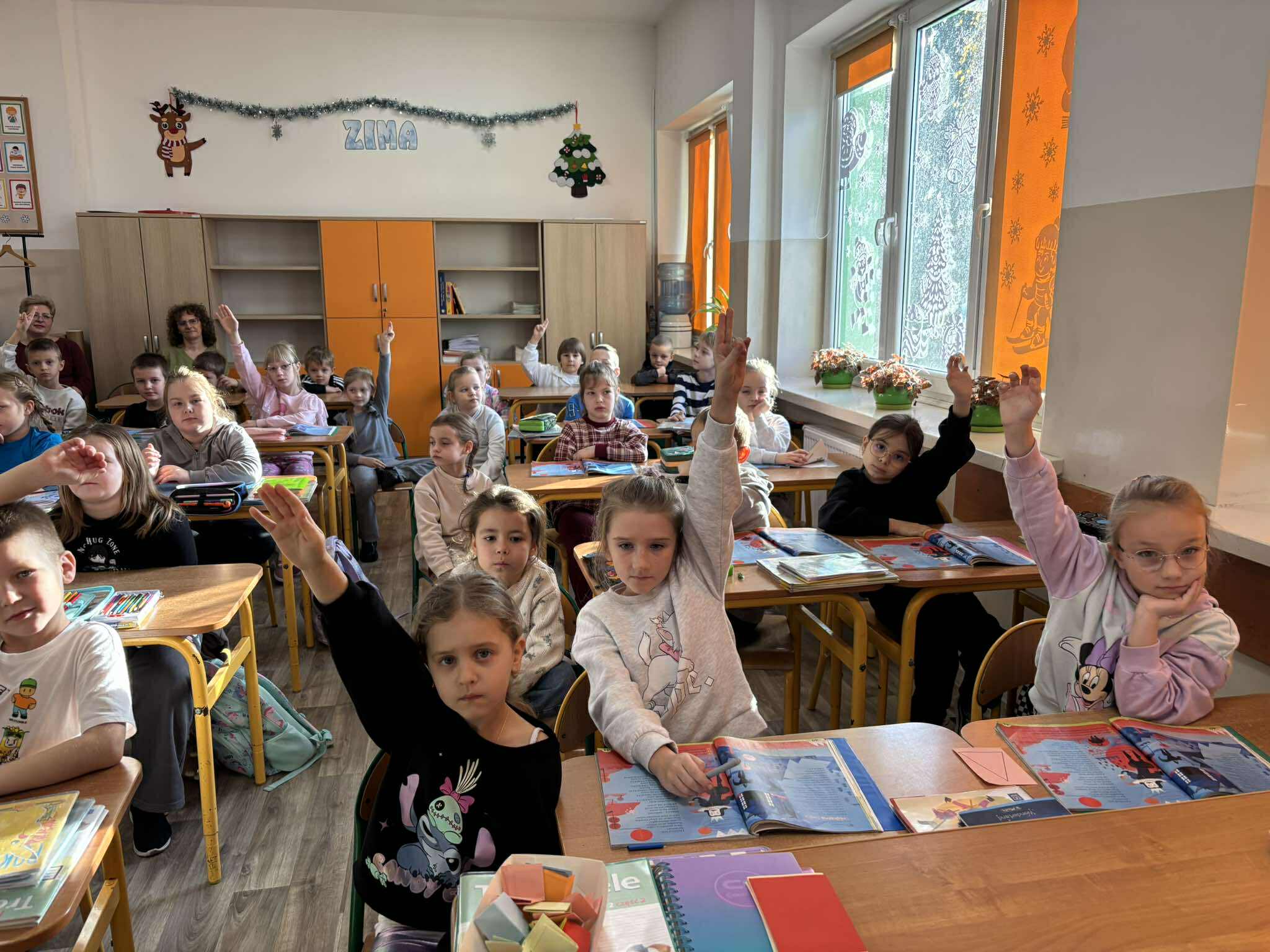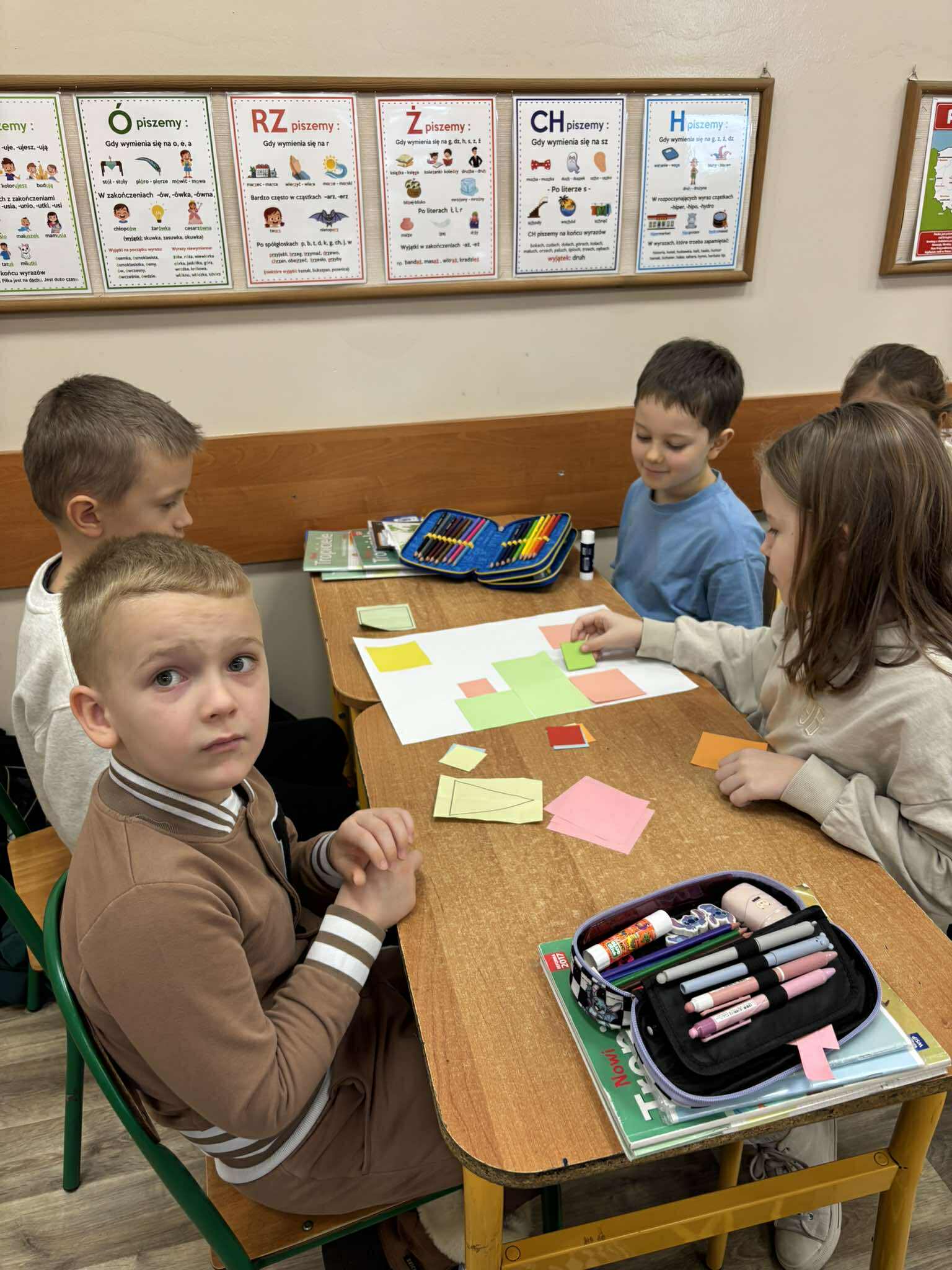 Nasi młodsi koledzy przenieśli się w zaczarowany świat wierszy, poznając historię z utworu „Trójkątna bajka”. Wspólnie odkrywaliśmy, jak wyglądała kraina figur oraz dlaczego wszystko w niej miało kształt trójkąta. Po wysłuchaniu bajki dzieci aktywnie odpowiadały na pytania, rozpoznawały figury geometryczne, dzieliły ich nazwy na sylaby oraz wyszukiwały je w sali. Nie zabrakło też zabaw interaktywnych, które sprawiły im mnóstwo radości. Na zakończenie starszaki wraz z uczniami klasy 2e wykonały kolorową pracę plastyczną pt. „Mój wyjątkowy świat”. Było twórczo, radośnie i pełno pozytywnej energii!