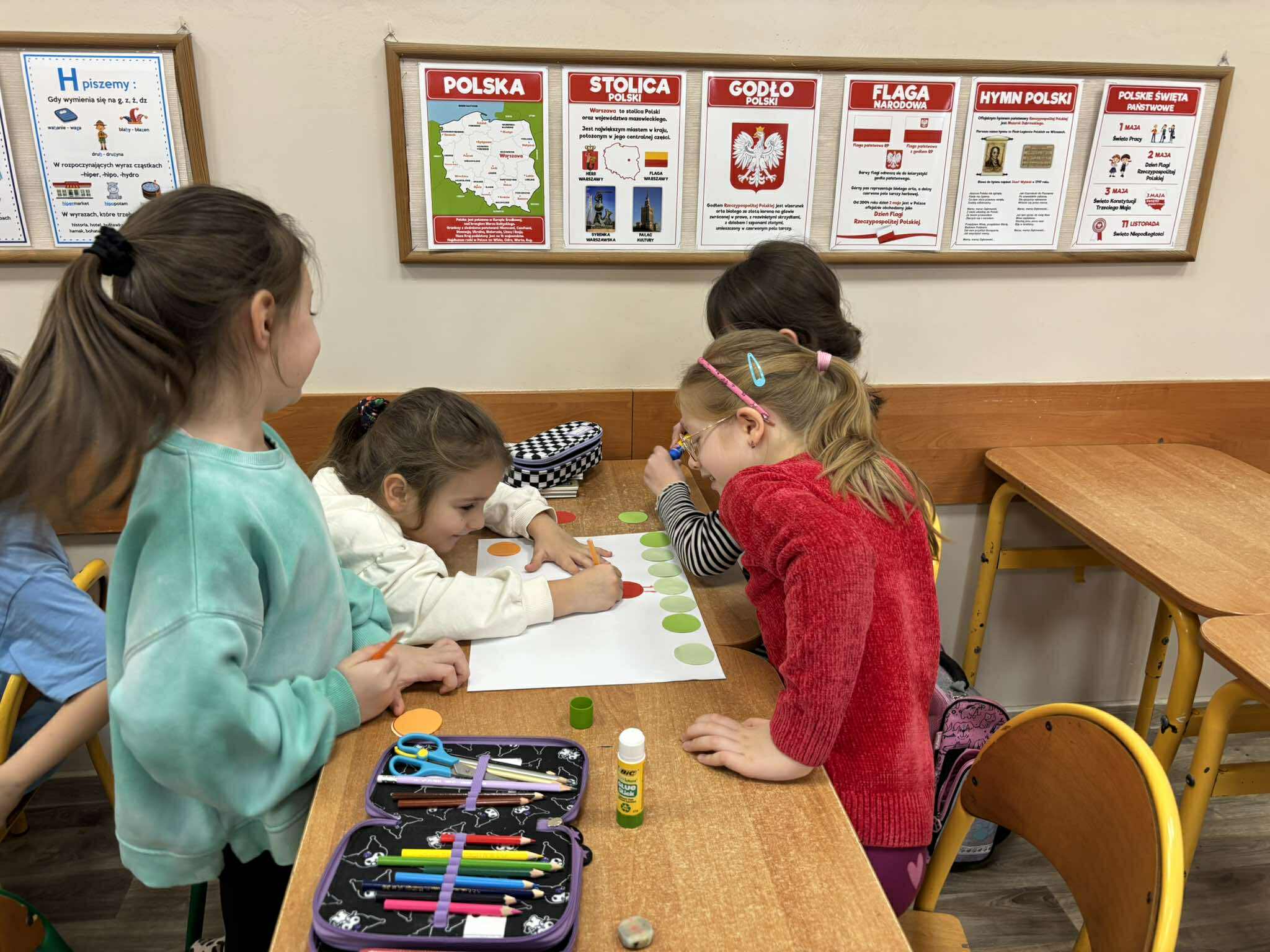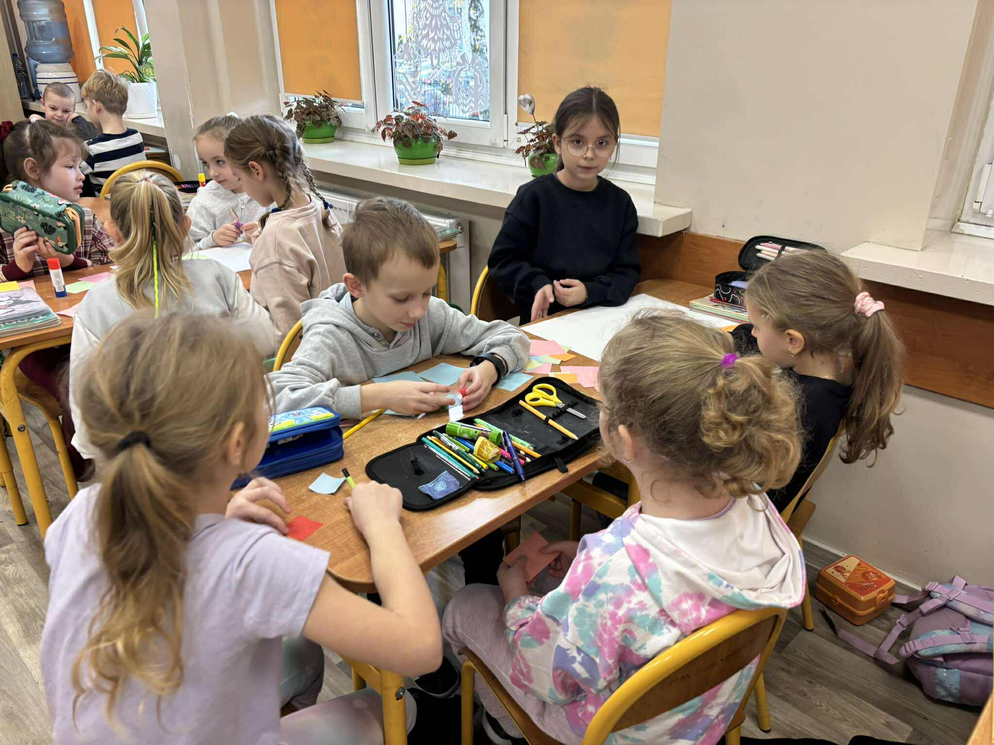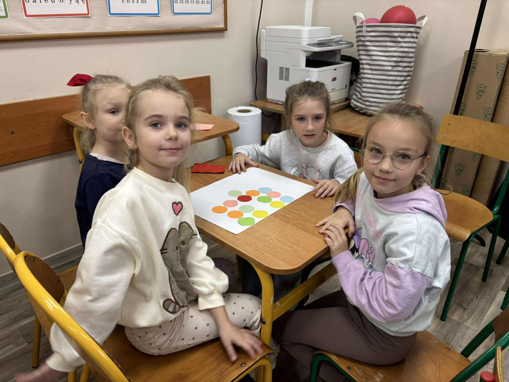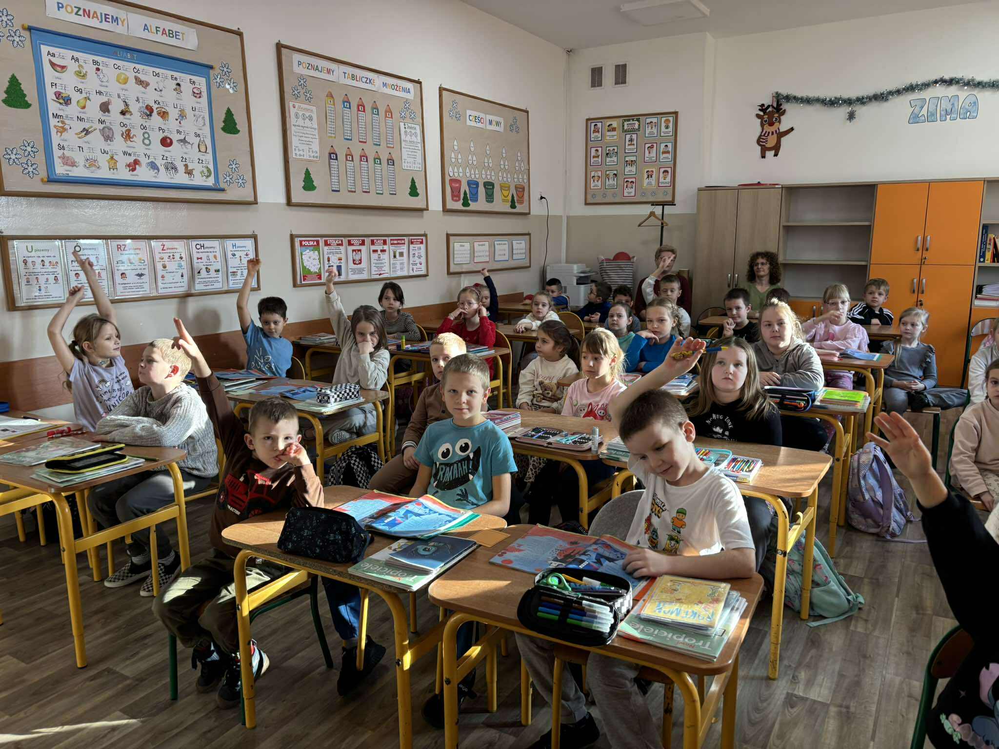 Nasi młodsi koledzy przenieśli się w zaczarowany świat wierszy, poznając historię z utworu „Trójkątna bajka”. Wspólnie odkrywaliśmy, jak wyglądała kraina figur oraz dlaczego wszystko w niej miało kształt trójkąta. Po wysłuchaniu bajki dzieci aktywnie odpowiadały na pytania, rozpoznawały figury geometryczne, dzieliły ich nazwy na sylaby oraz wyszukiwały je w sali. Nie zabrakło też zabaw interaktywnych, które sprawiły im mnóstwo radości. Na zakończenie starszaki wraz z uczniami klasy 2e wykonały kolorową pracę plastyczną pt. „Mój wyjątkowy świat”. Było twórczo, radośnie i pełno pozytywnej energii!