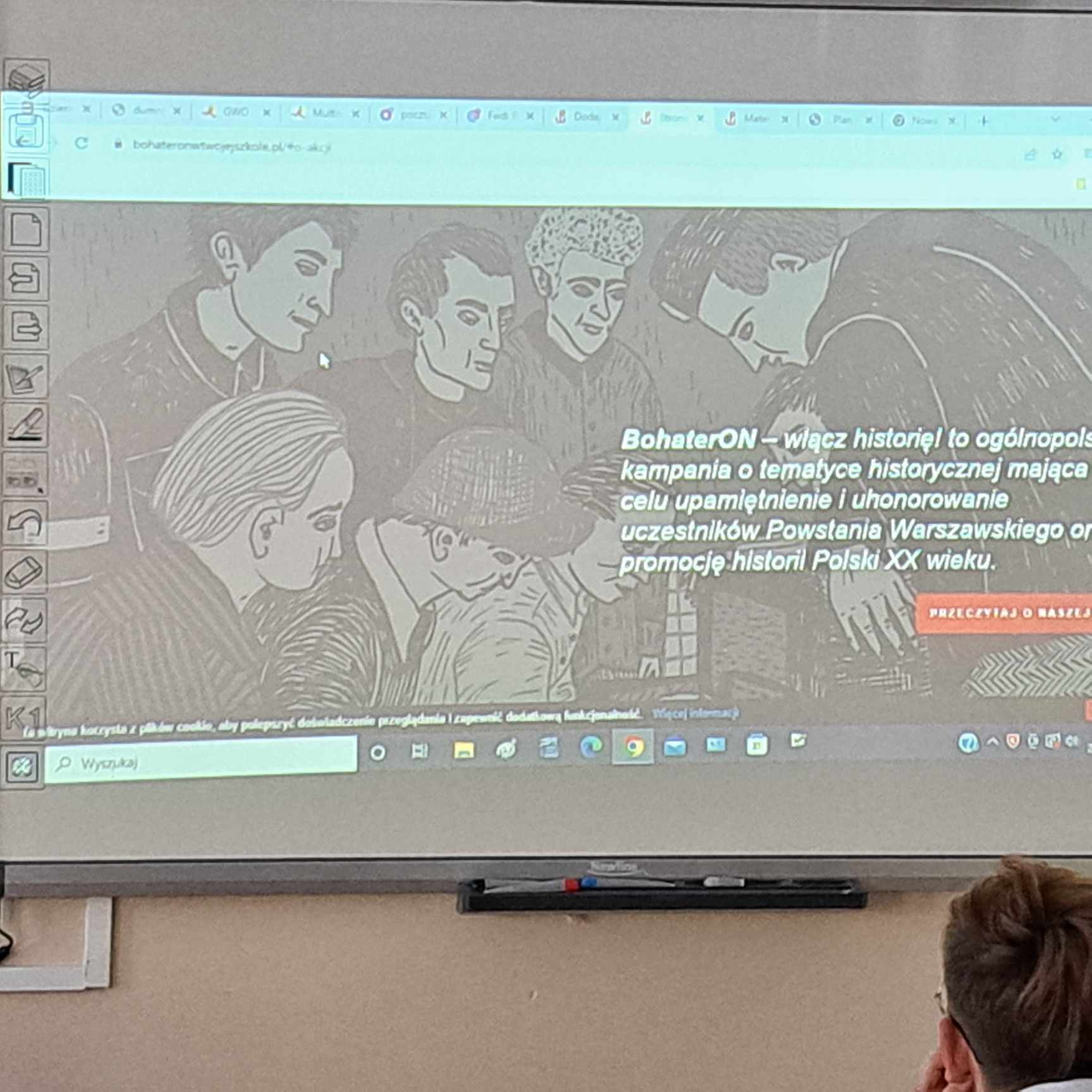 Uczniowie klas 7c i 6b wzięli udział w ogólnopolskiej kampanii BohaterOn – włącz historię. Jest to akcja o tematyce historycznej mająca na celu upamiętnienie i uhonorowanie uczestników Powstania Warszawskiego oraz promocję historii Polski XX wieku . Uczniowie uczestniczyli w zajęciach prowadzonych na podstawie udostępnionych przez organizatora materiałów oraz dokonali wpisów na stronie wpis.dumnizpowstancow.pl