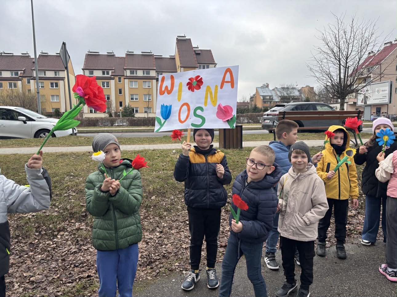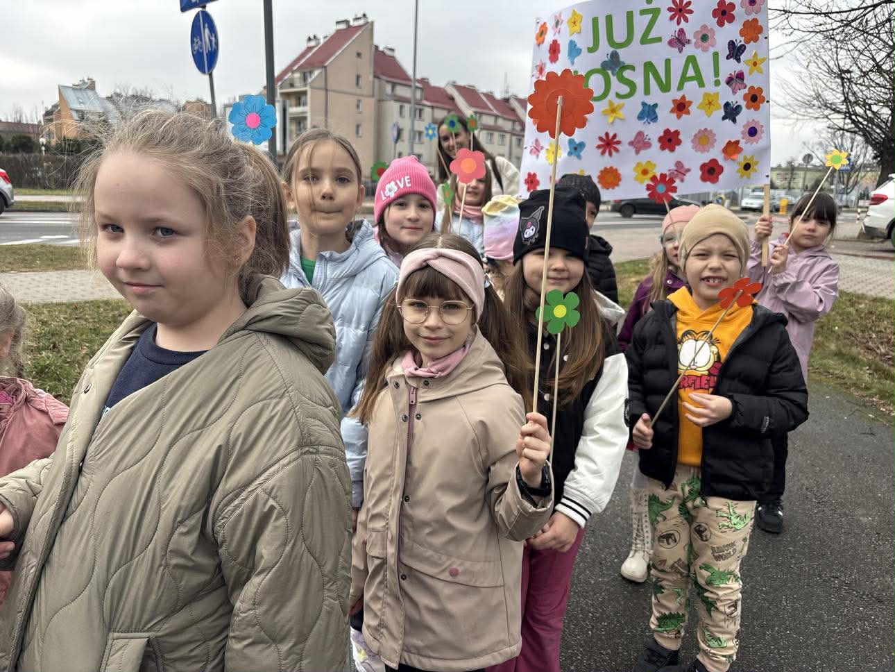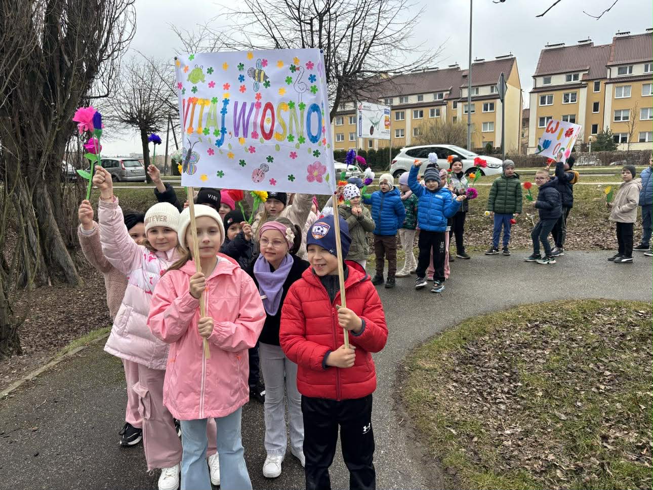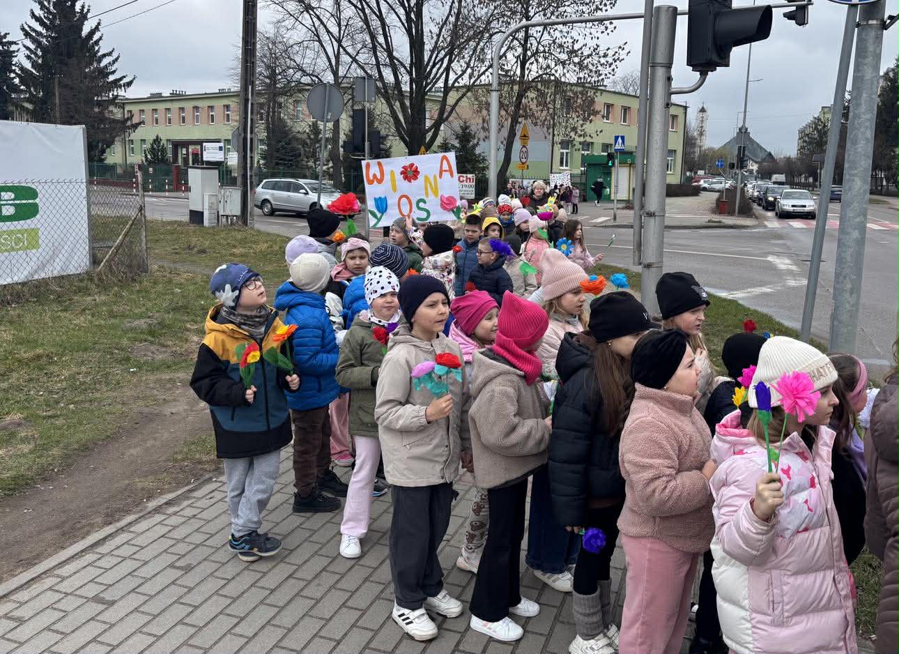 W piątek, 20 marca 2026 roku, uczniowie klas pierwszych uroczyście powitali wiosnę w parku. Mimo pochmurnej pogody, dzieci z entuzjazmem maszerowały w barwnym korowodzie, niosąc własnoręcznie przygotowane kwiaty i hasła. Ważnym punktem programu był również element sportowy – wszyscy uczestnicy z sukcesem przebiegli wyznaczony dystans, świętując nadejście nowej pory roku w ruchu i radosnej atmosferze.