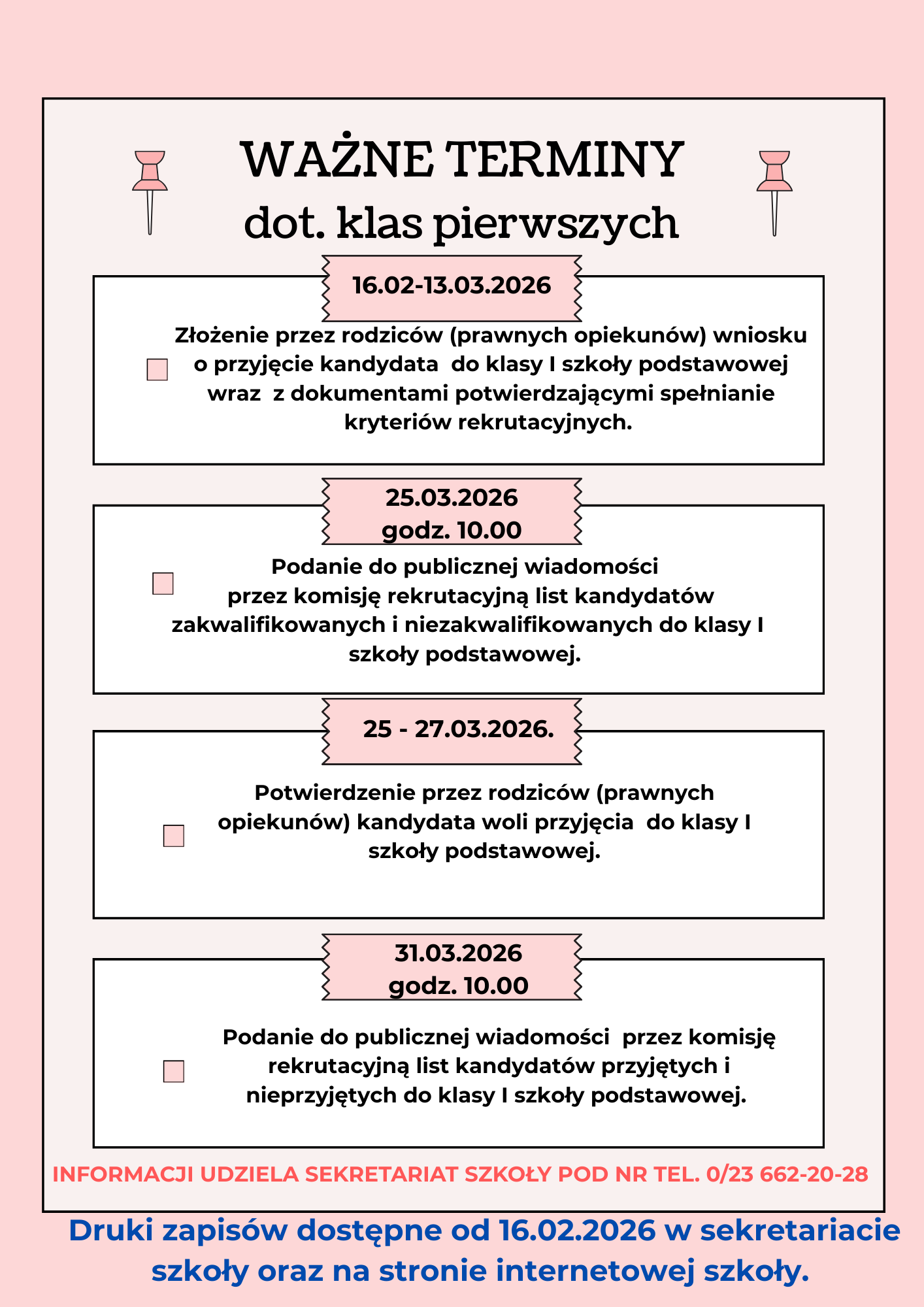 | Podanie do publicznej wiadomości przez komisję rekrutacyjną list kandydatów przyjętych i nieprzyjętych do klasy I szkoły podstawowej. | 31.03.2026 r. godz. 10.00 | 21.08.2026 r. godz. 10.00 |