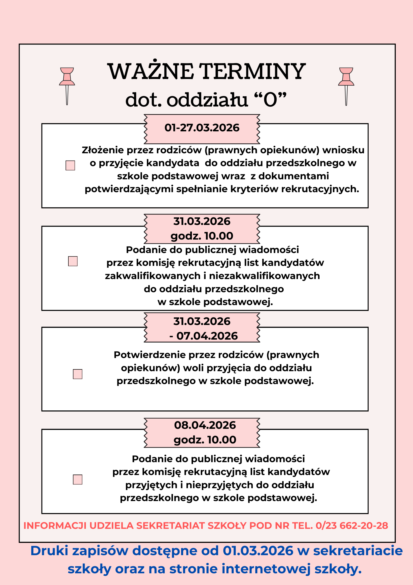 - zarządzenia Nr 0050.24.2026 Burmistrza Miasta Płońska z dnia 29 stycznia 2026 w sprawie ustalenia terminów przeprowadzania postępowania rekrutacyjnego i postępowania uzupełniającego, w tym terminów składania dokumentów do publicznych przedszkoli i oddziałów przedszkolnych w publicznych szkołach podstawowych oraz klas pierwszych publicznych szkół podstawowych, prowadzonych przez Gminę Miasto Płońsk na rok szkolny 2026/2027.