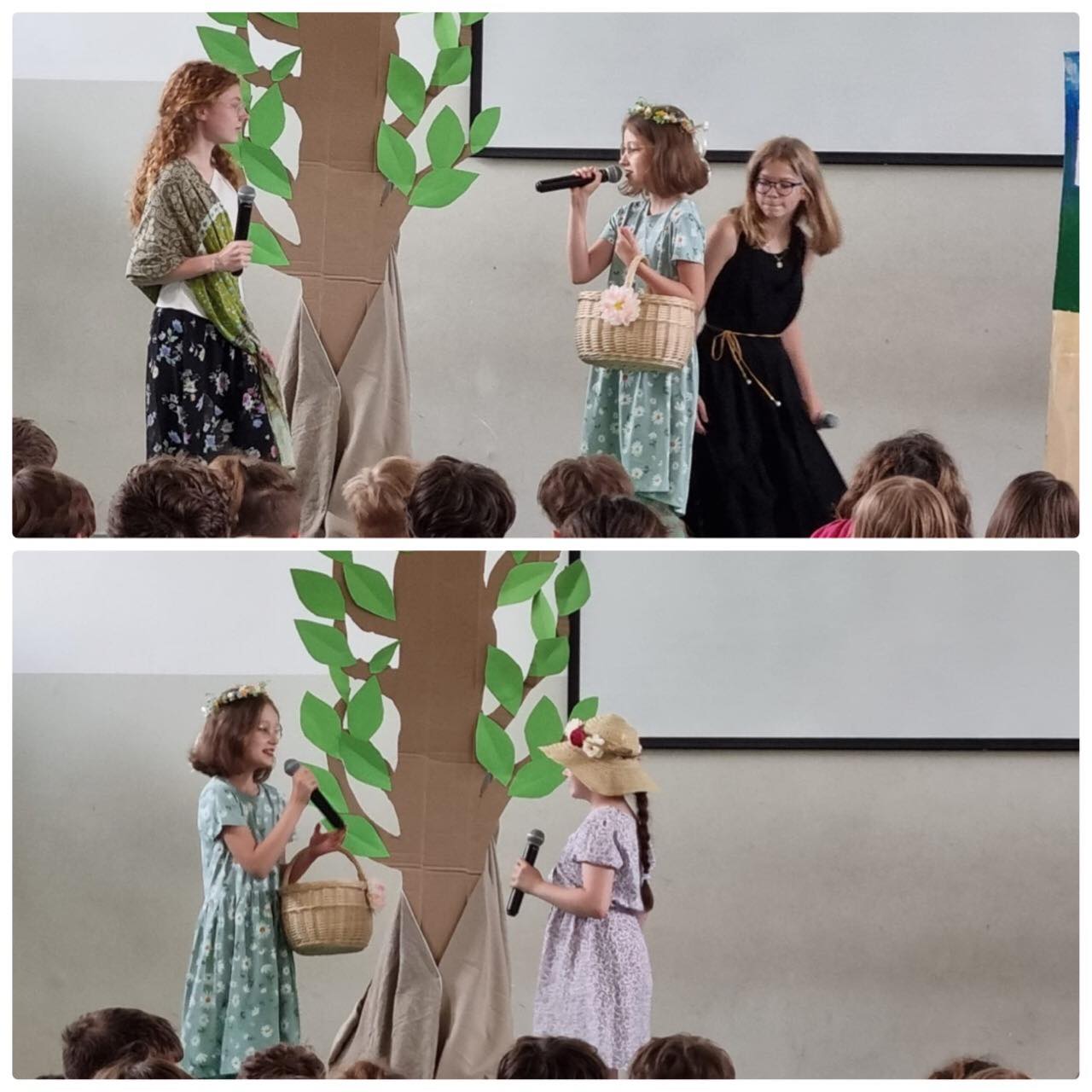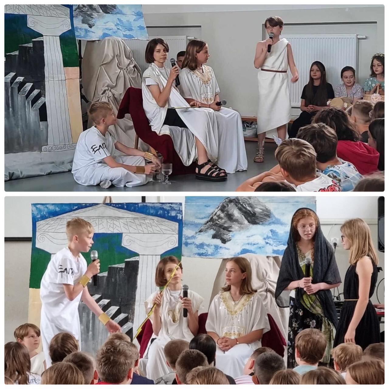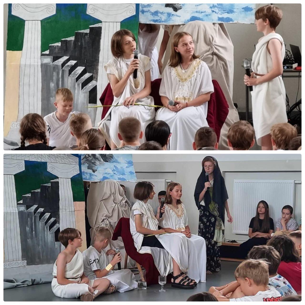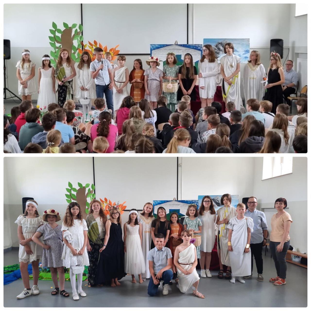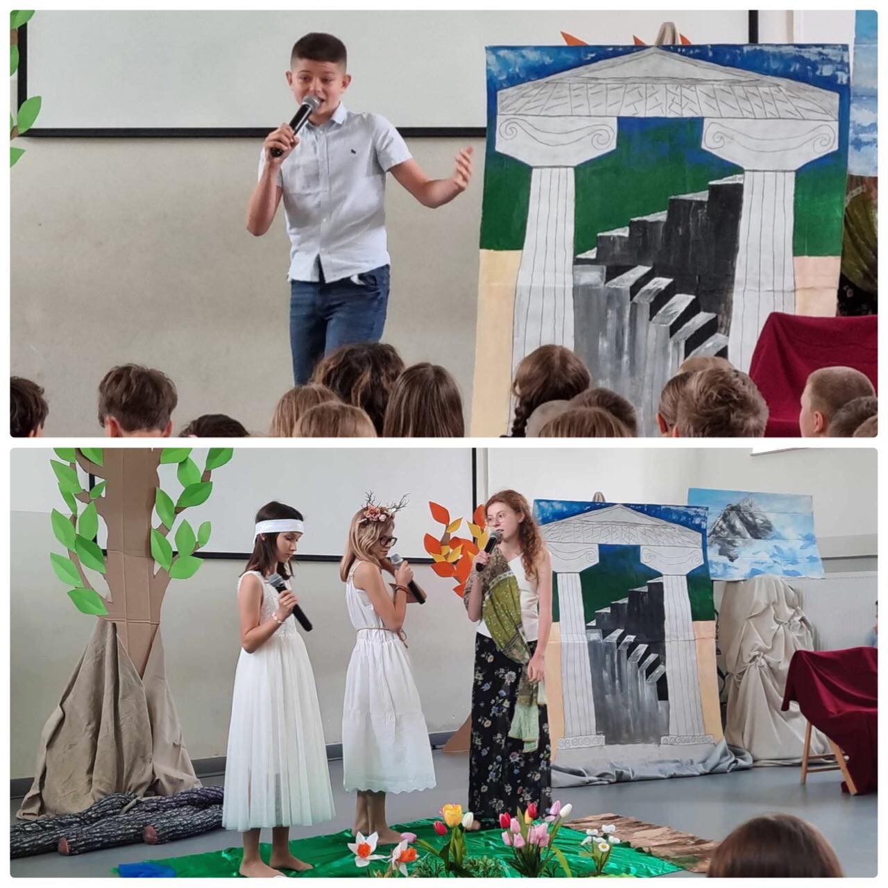 Czy coś wspólnego może mieć z nimi tęsknota matki za córką? Na te oraz inne pytania znajdziemy odpowiedź w teatralnej interpretacji mitu o Demeter i Persefonie, którą przygotowali uczniowie klas 5c i 5d w dniu 5 czerwca 2024 r. pod kierunkiem nauczyciela języka polskiego p. Łukasza Kwiatkowskiego we współpracy z nauczycielem bibliotekarzem p. Kariną Godlewską-Sobótką. Przedstawienie zainicjowane przez piątoklasistów było doskonałą okazją do odświeżenia wiedzy o mitologii oraz pomogło zrozumieć, że mimo zmieniającego się świata, ludzkie uczucia pozostają takie same. ![]()