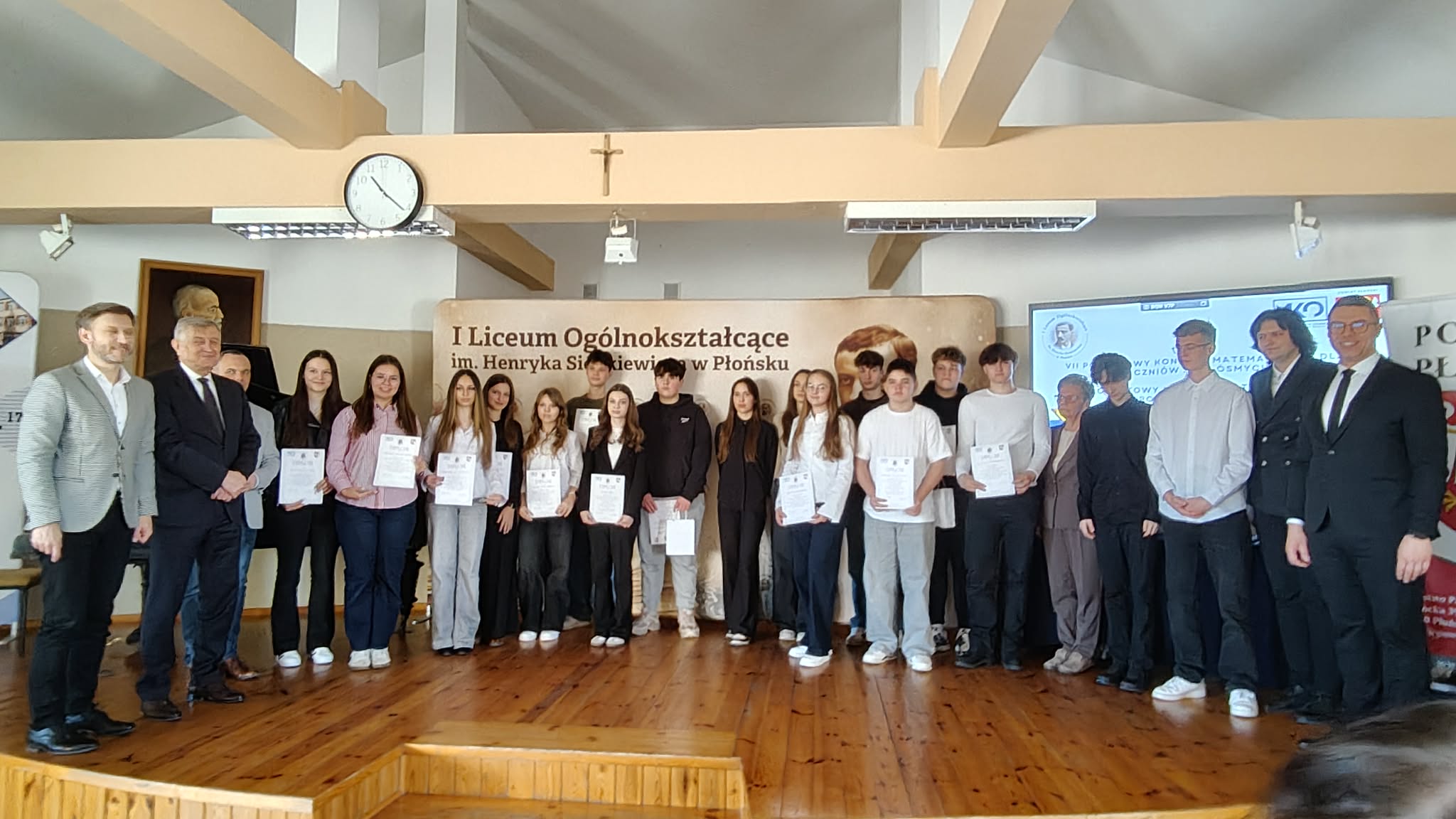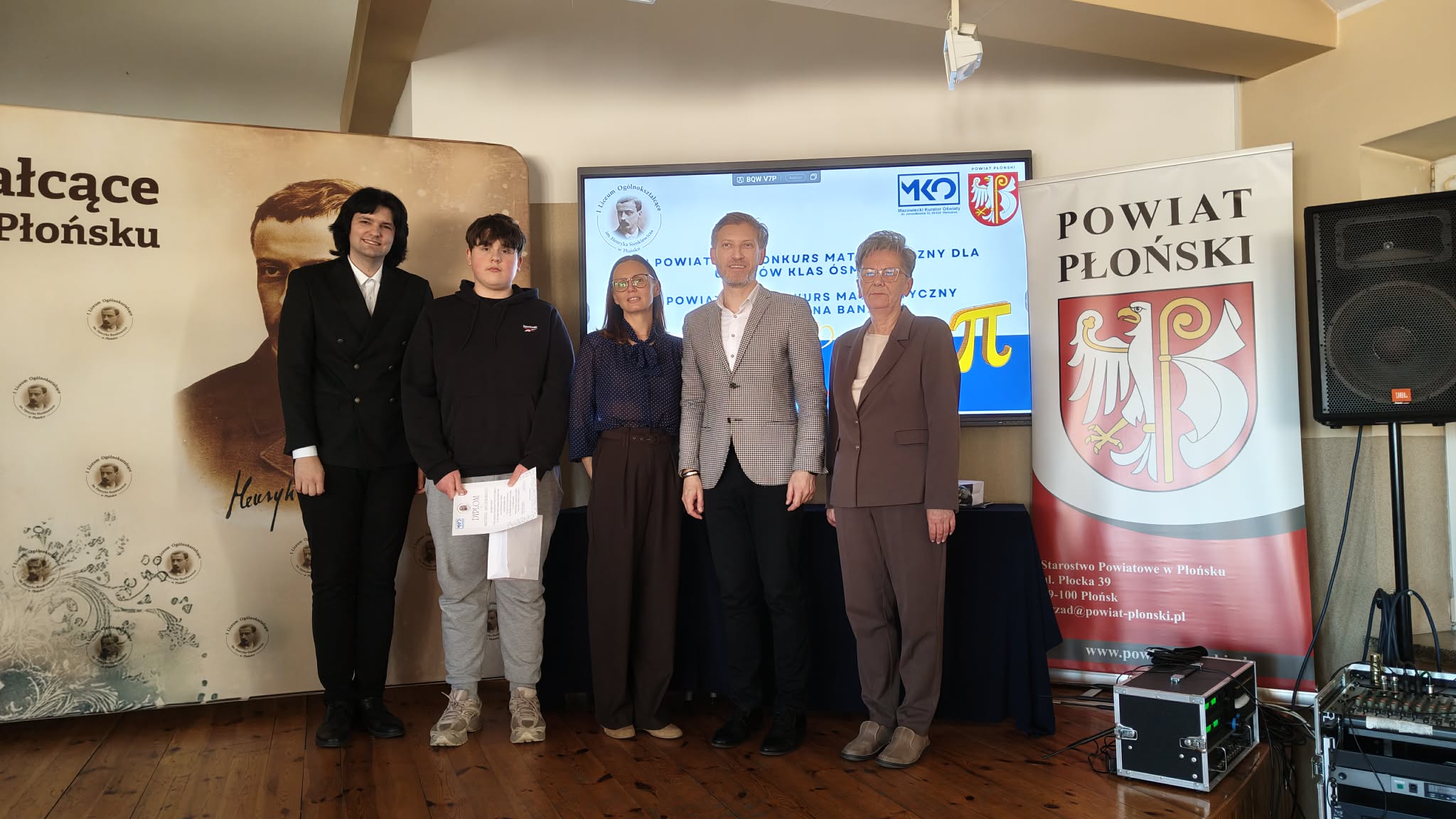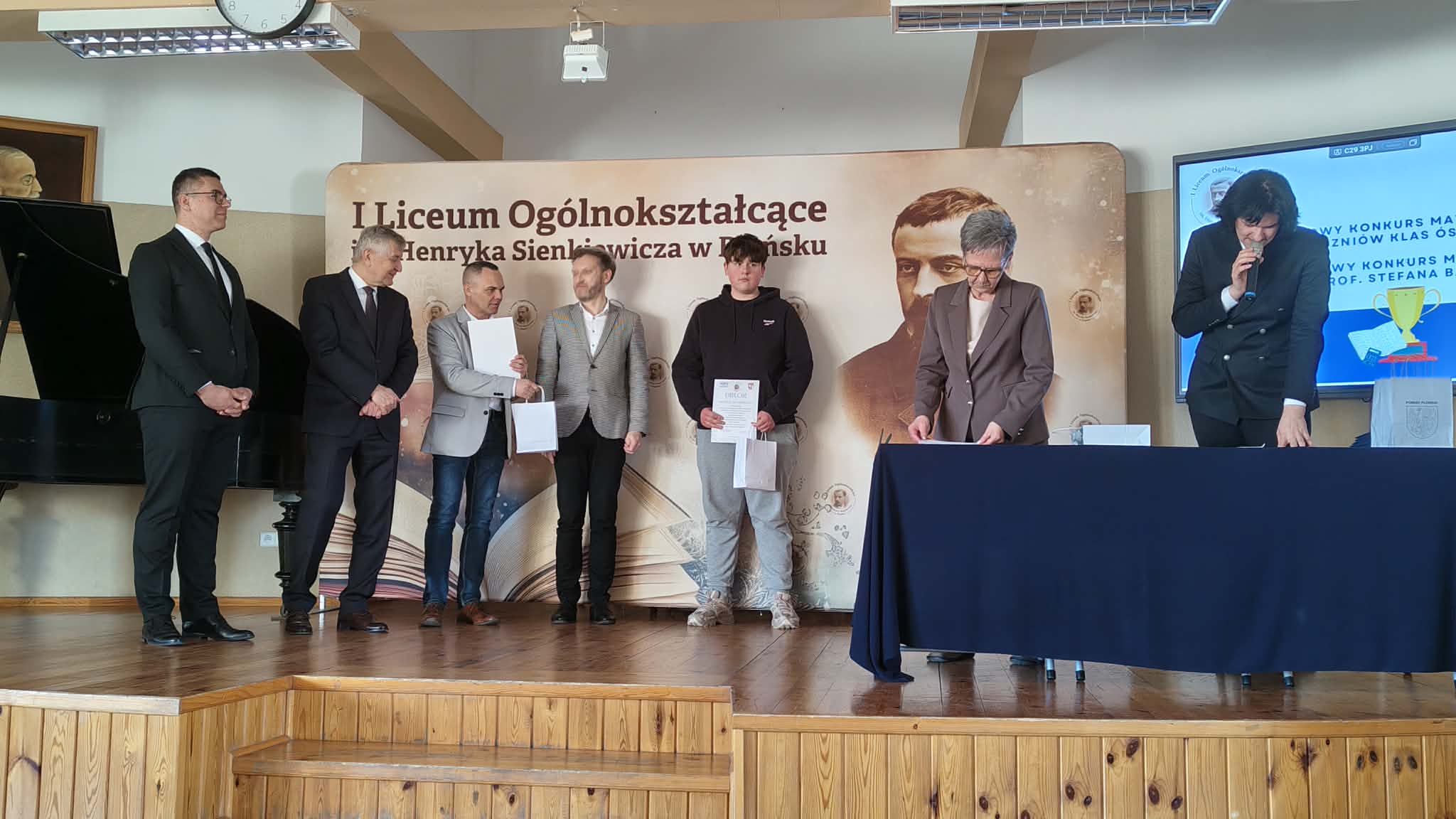 W dniu 27 marca 2026 roku, w I Liceum Ogólnokształcącym im. Henryka Sienkiewicza odbyło się uroczyste wręczenie nagród w VII Powiatowym Konkursie Matematycznym dla uczniów klas ósmych. W wydarzeniu wzięli udział nagrodzeni uczniowie, nauczyciele oraz zaproszeni goście. Jednym z wyróżnionych uczniów był Mateusz Janczewski z klasy 8b, który zdobył tytuł II wicemistrza. Osiągnięcie to jest dowodem jego dużej wiedzy matematycznej, systematycznej pracy oraz zaangażowania. Uroczystość przebiegła w podniosłej atmosferze, a wszystkim laureatom serdecznie pogratulowano i życzono dalszych sukcesów w nauce.