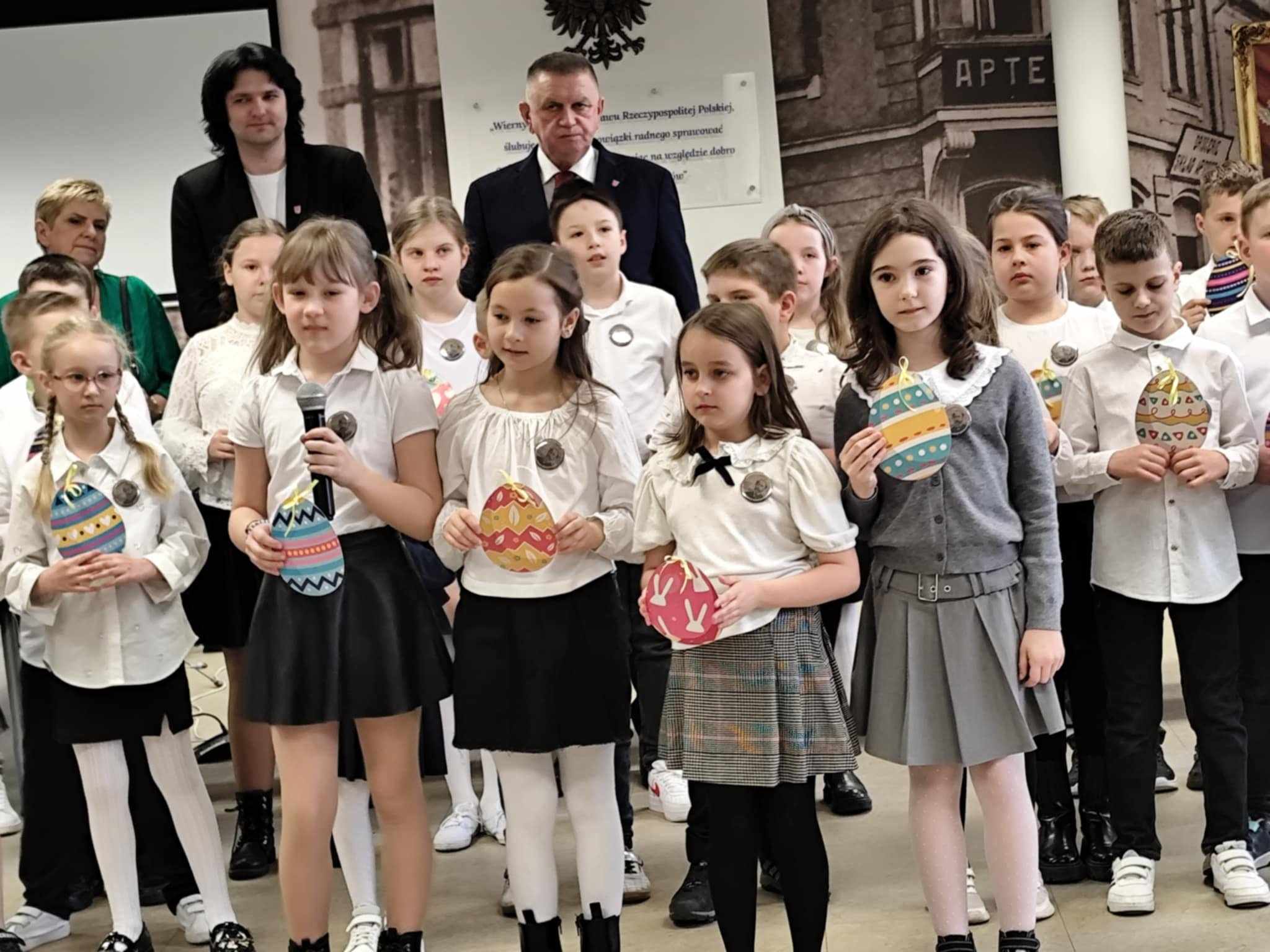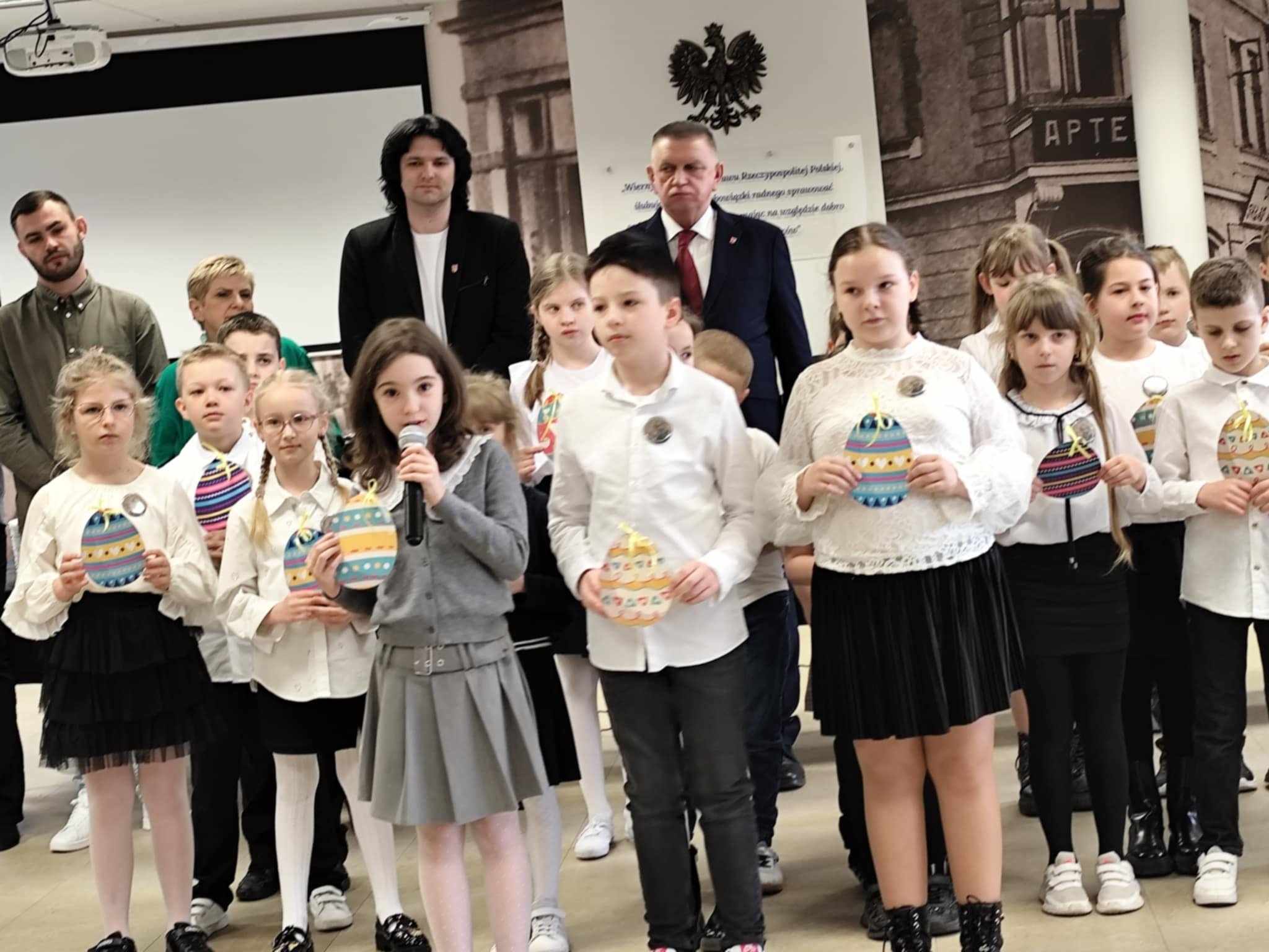 Uczniowie wręczyli zebranym papierowe pisanki z życzeniami, które wykonała firma VIk-PLAST Joanna i Artur Traczyńscy.