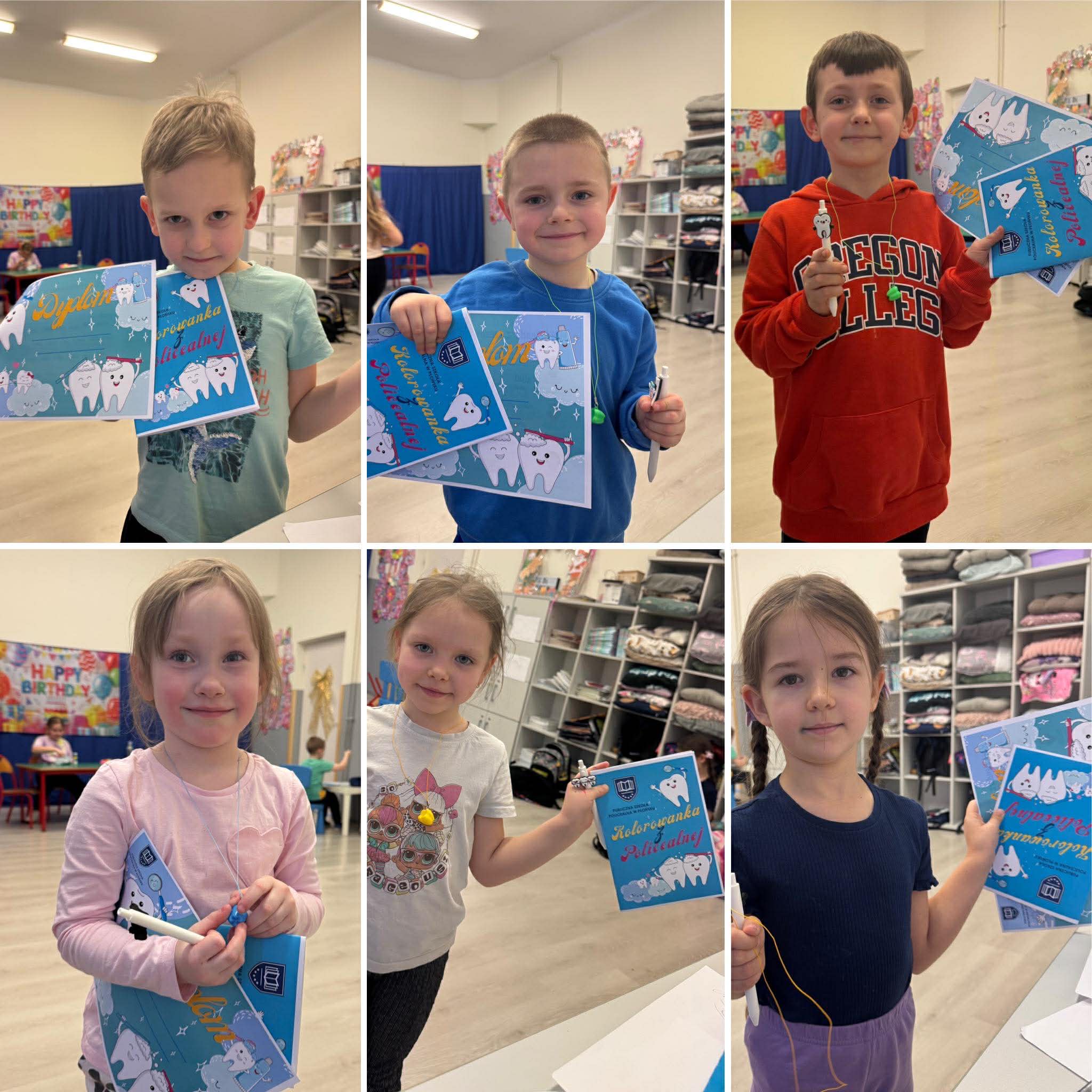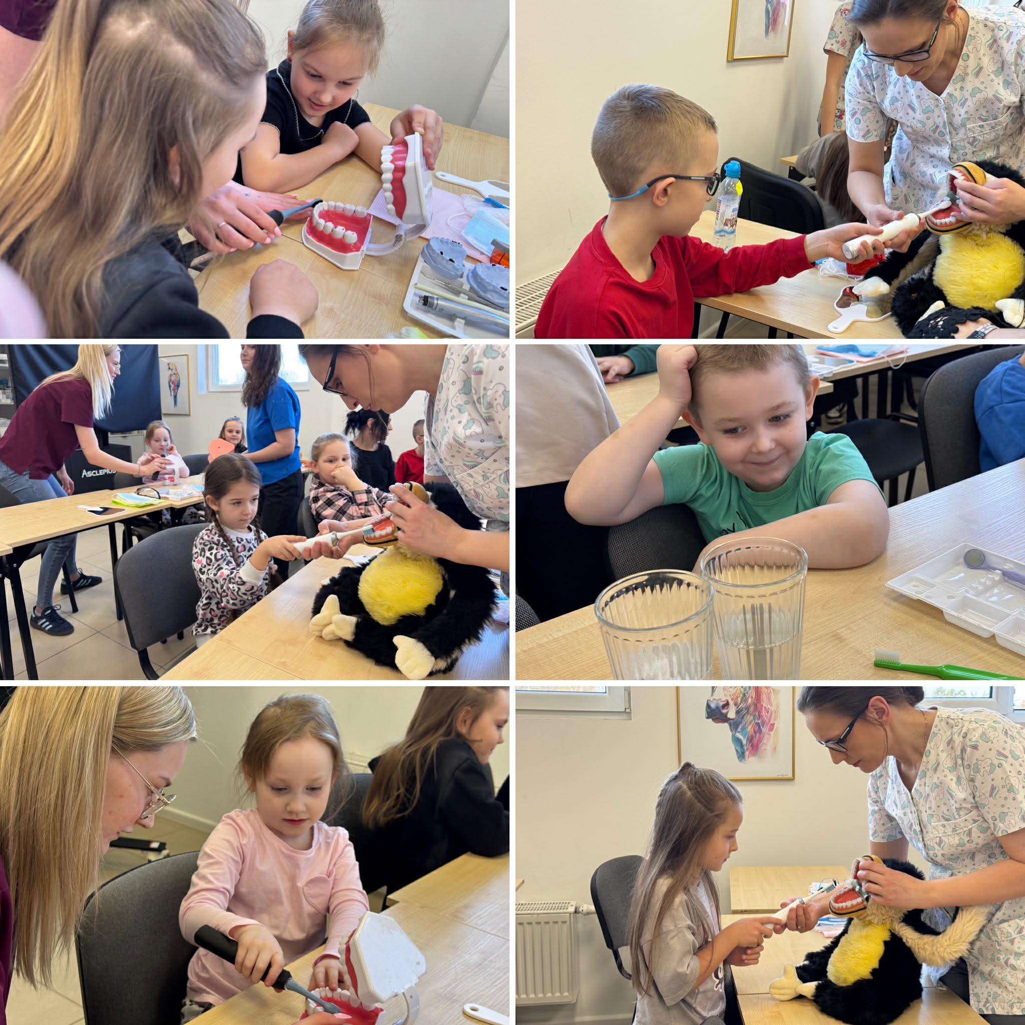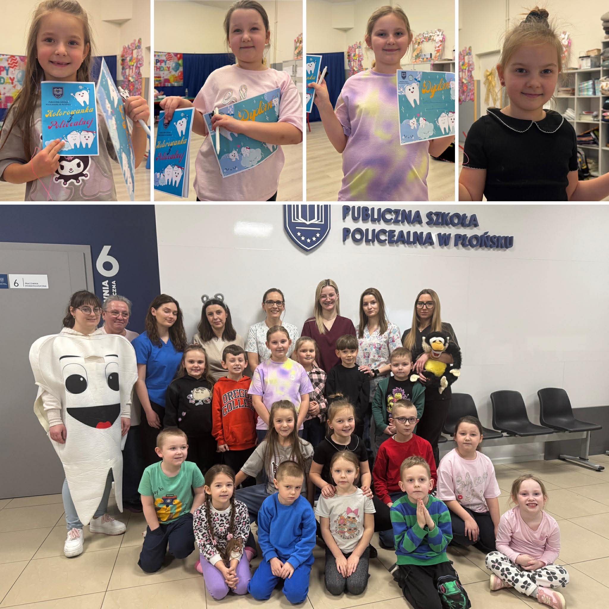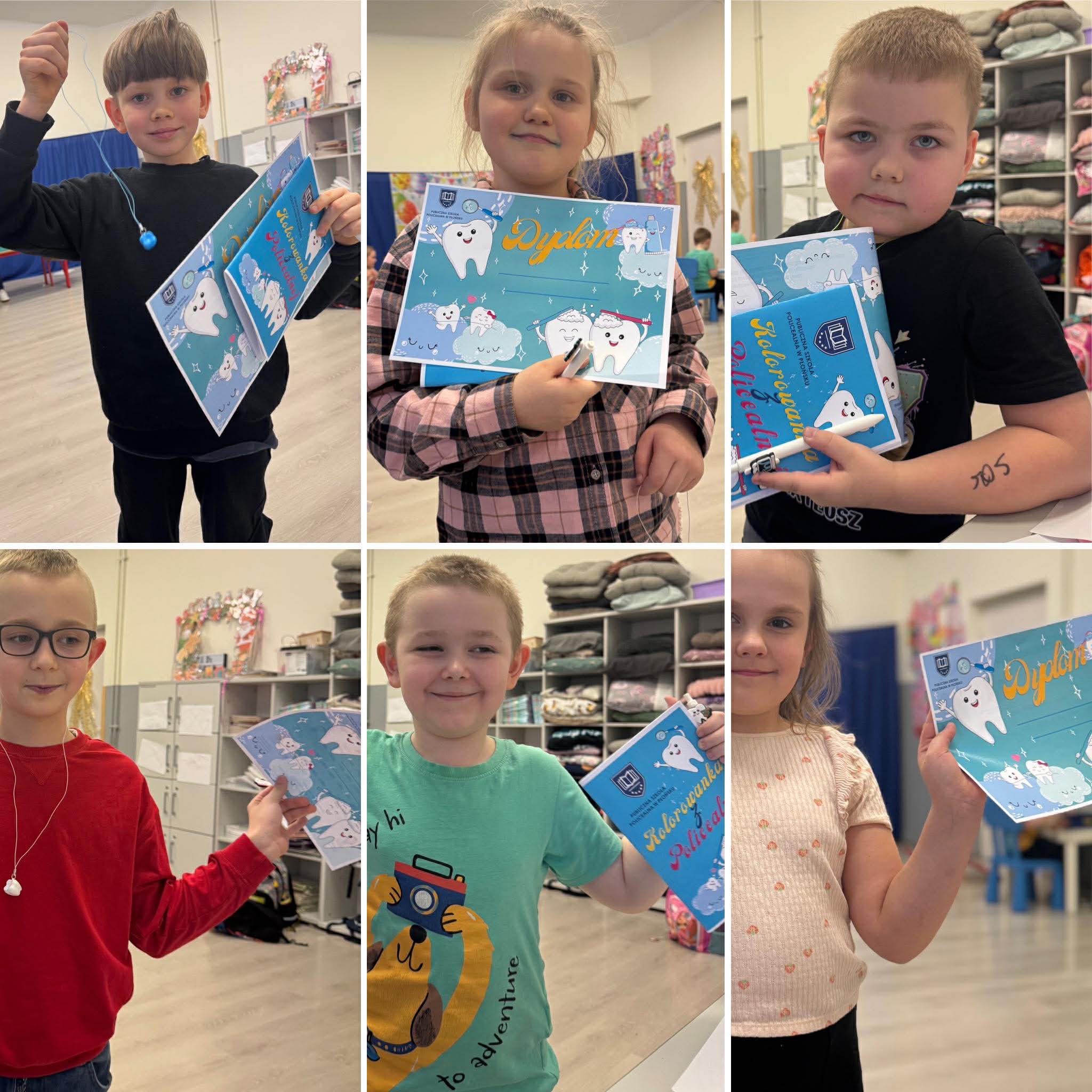 W piątek 6 marca 2026 roku dzieci z oddziału przedszkolnego udały się na zajęcia do Publicznej Policealnej Szkoły w Płońsku. Uczestniczyły w bardzo ciekawych zajęciach, podczas których dowiedziały się, co jest zdrowe i niezdrowe dla ząbków, jak należy o nie dbać i jak szczotkować. Obserwowały doświadczenie działania gazowanego słodzonego napoju na kredę z pastą do zębów na niej lub bez niej. Miały okazję dotknąć jajko, na które wcześniej działał ocet i co stało się ze z jego skorupką. Miały okazję sprawdzić, czy fotel dentystyczny jest wygodny oraz obejrzeć swoje ząbki na ekranie monitora. Ubrane w odpowiedni strój do pracy, uzupełniały model szczęki z ubytkami używając specjalnej masy i dentystycznych narzędzi. To były bardzo ciekawe zajęcia, za które dzieci bardzo dziękują. W podziękowaniu przygotowały kolekcję wesołych ząbków i laurkę dla Pani Moniki i jej asystentek. To były bardzo ciekawe zajęcia. Za udział w nich dzieci dostały dyplom, kolorowankę, długopis z ząbkiem oraz pojemniczek na ząbek. Dziękujemy.