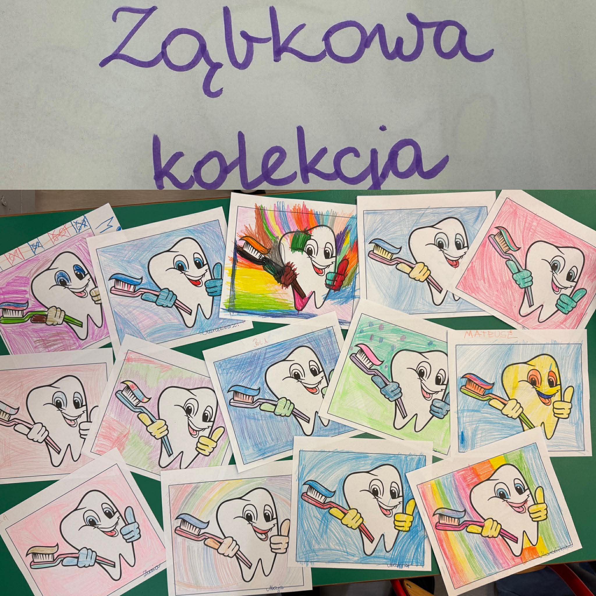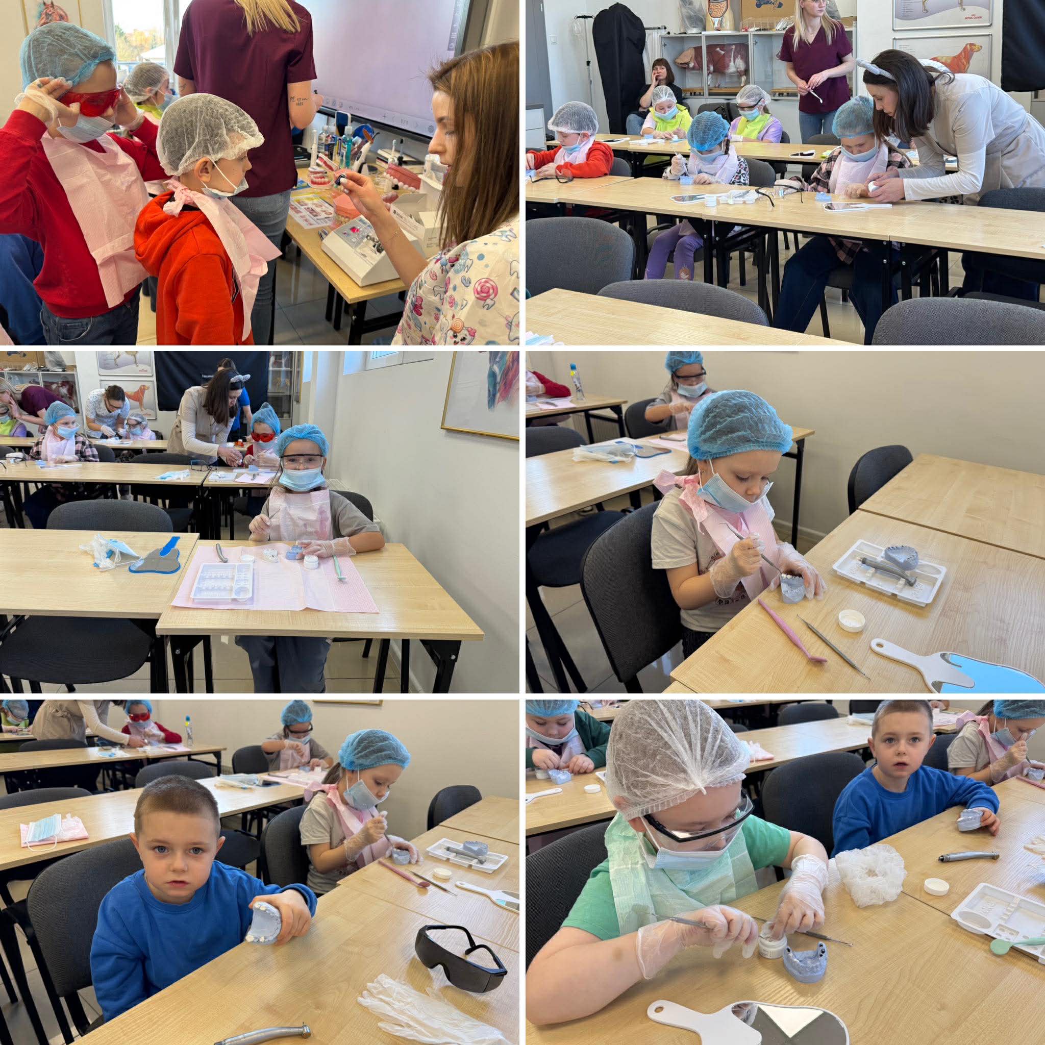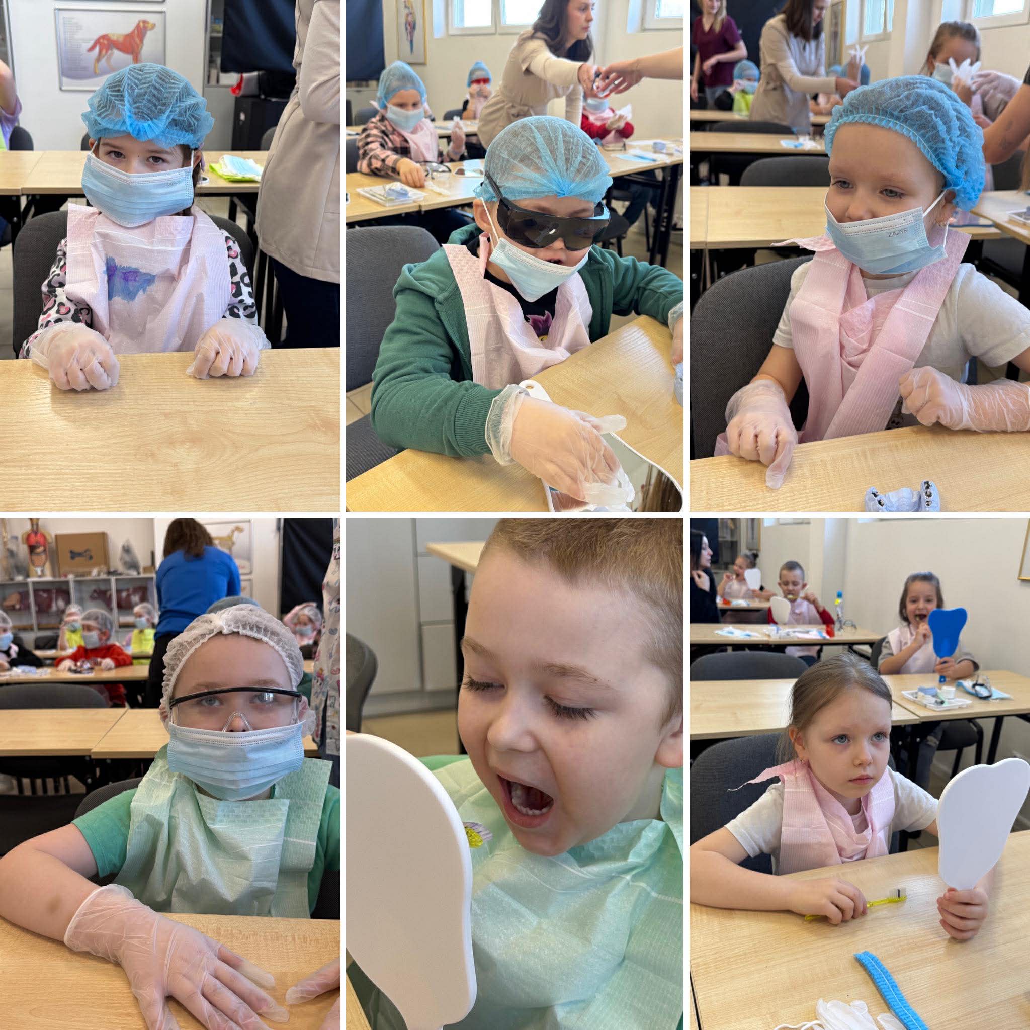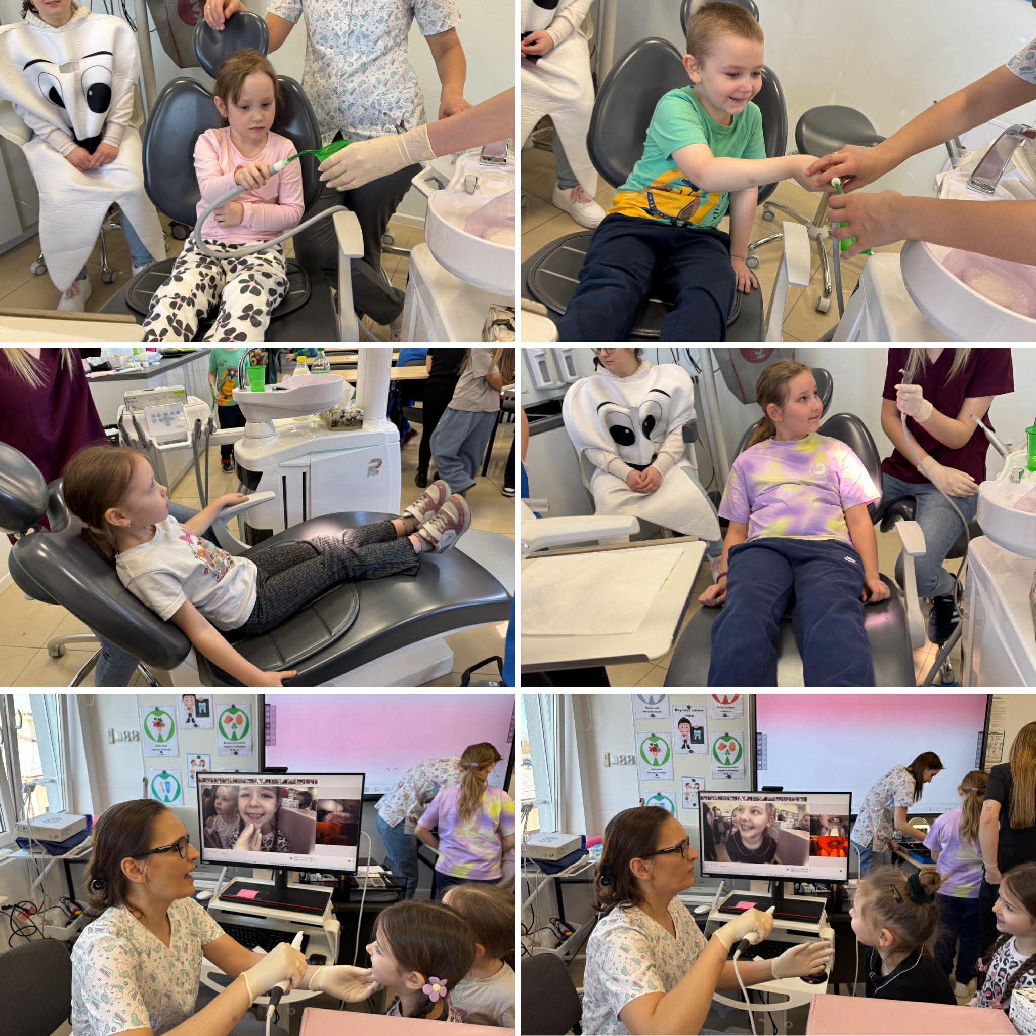 W piątek 6 marca 2026 roku dzieci z oddziału przedszkolnego udały się na zajęcia do Publicznej Policealnej Szkoły w Płońsku. Uczestniczyły w bardzo ciekawych zajęciach, podczas których dowiedziały się, co jest zdrowe i niezdrowe dla ząbków, jak należy o nie dbać i jak szczotkować. Obserwowały doświadczenie działania gazowanego słodzonego napoju na kredę z pastą do zębów na niej lub bez niej. Miały okazję dotknąć jajko, na które wcześniej działał ocet i co stało się ze z jego skorupką. Miały okazję sprawdzić, czy fotel dentystyczny jest wygodny oraz obejrzeć swoje ząbki na ekranie monitora. Ubrane w odpowiedni strój do pracy, uzupełniały model szczęki z ubytkami używając specjalnej masy i dentystycznych narzędzi. To były bardzo ciekawe zajęcia, za które dzieci bardzo dziękują. W podziękowaniu przygotowały kolekcję wesołych ząbków i laurkę dla Pani Moniki i jej asystentek. To były bardzo ciekawe zajęcia. Za udział w nich dzieci dostały dyplom, kolorowankę, długopis z ząbkiem oraz pojemniczek na ząbek. Dziękujemy.
