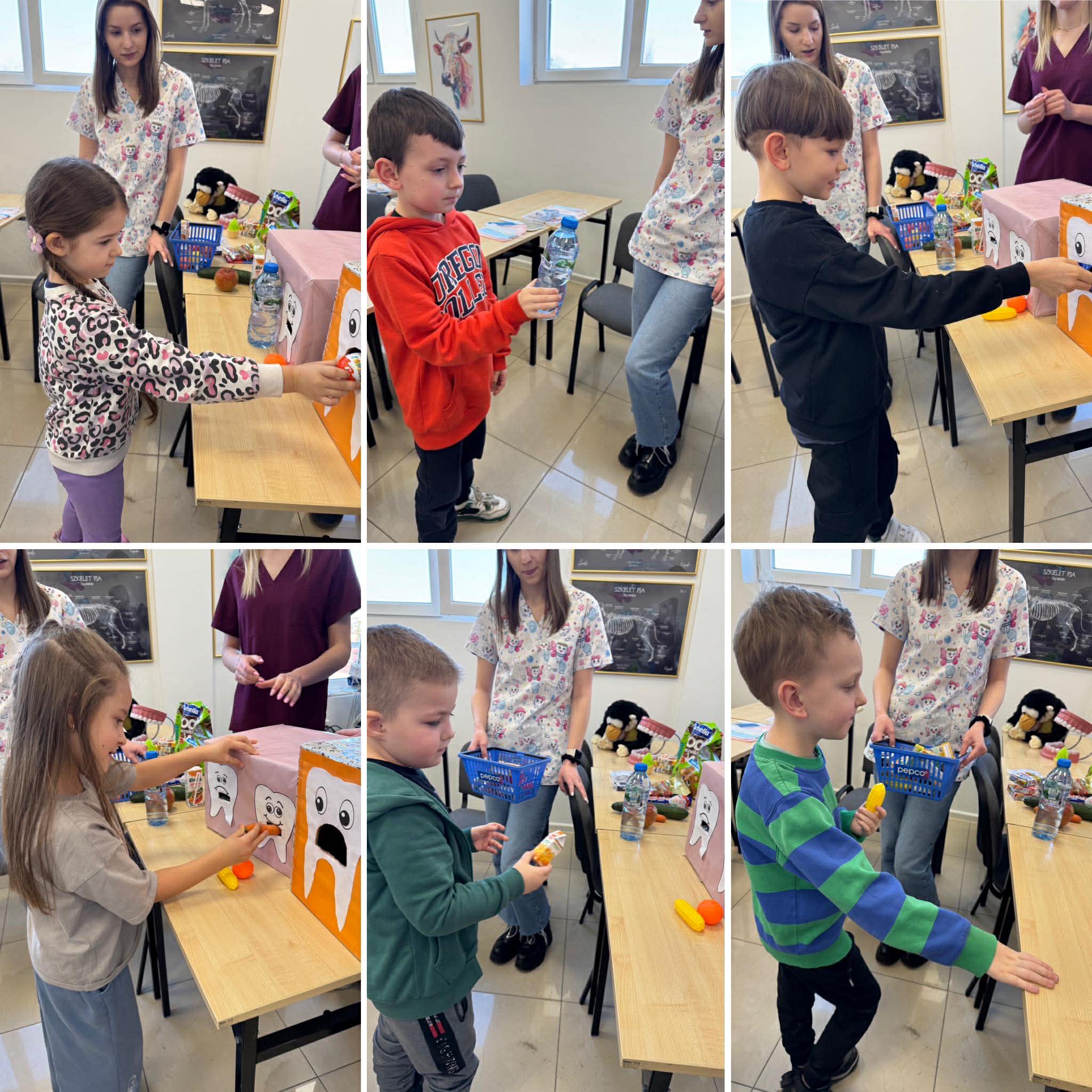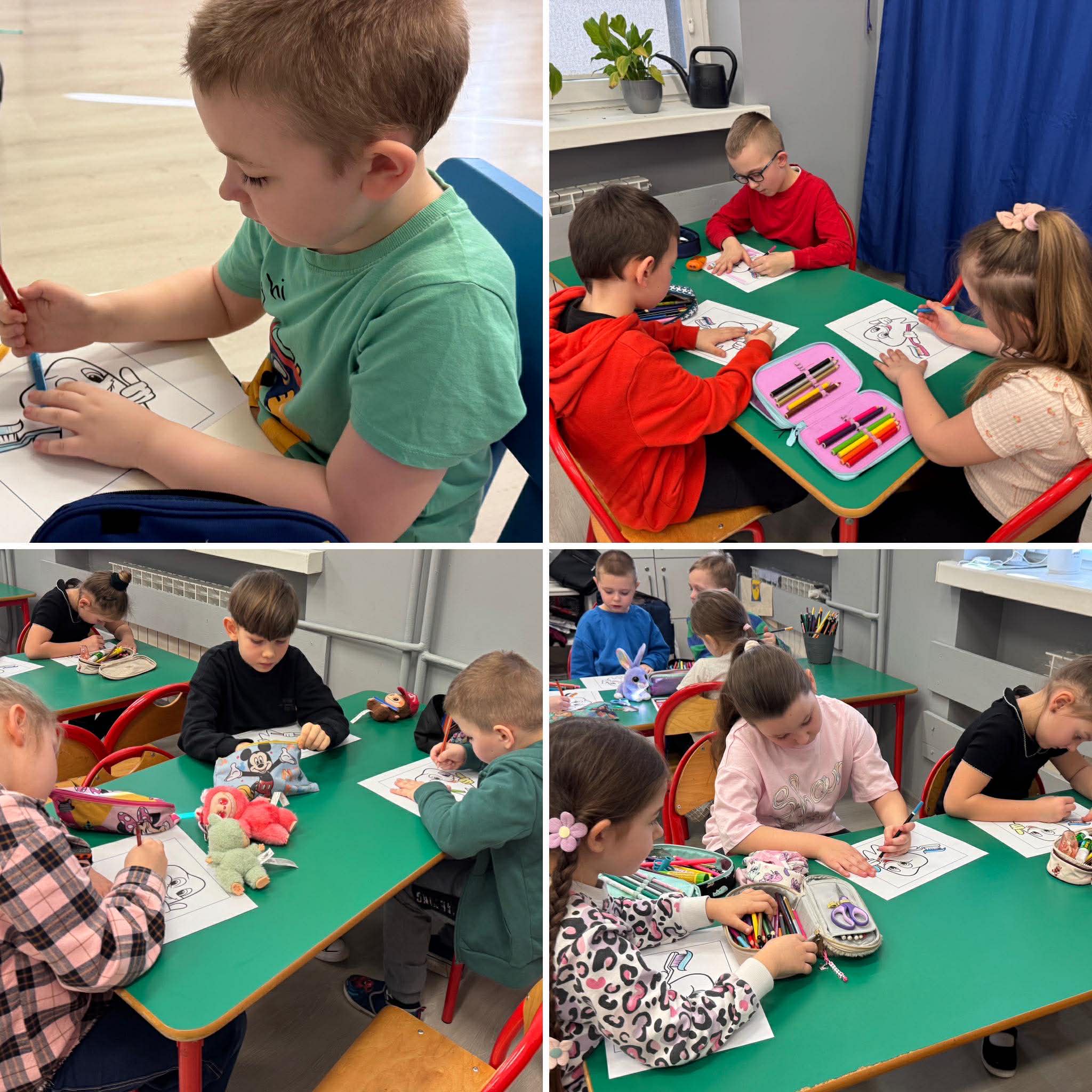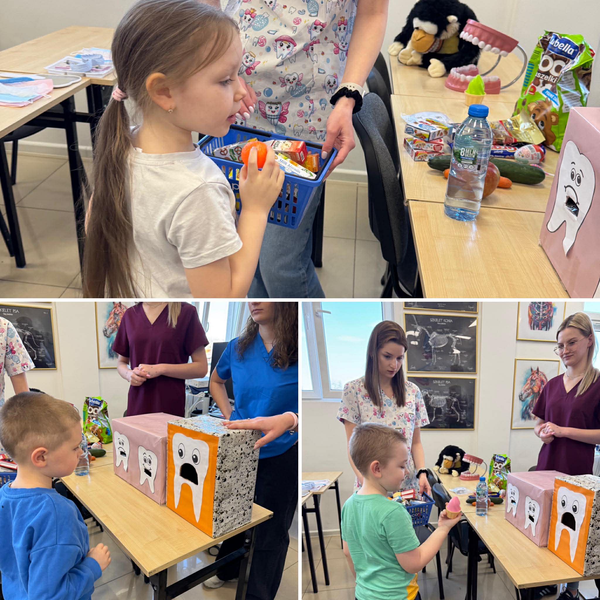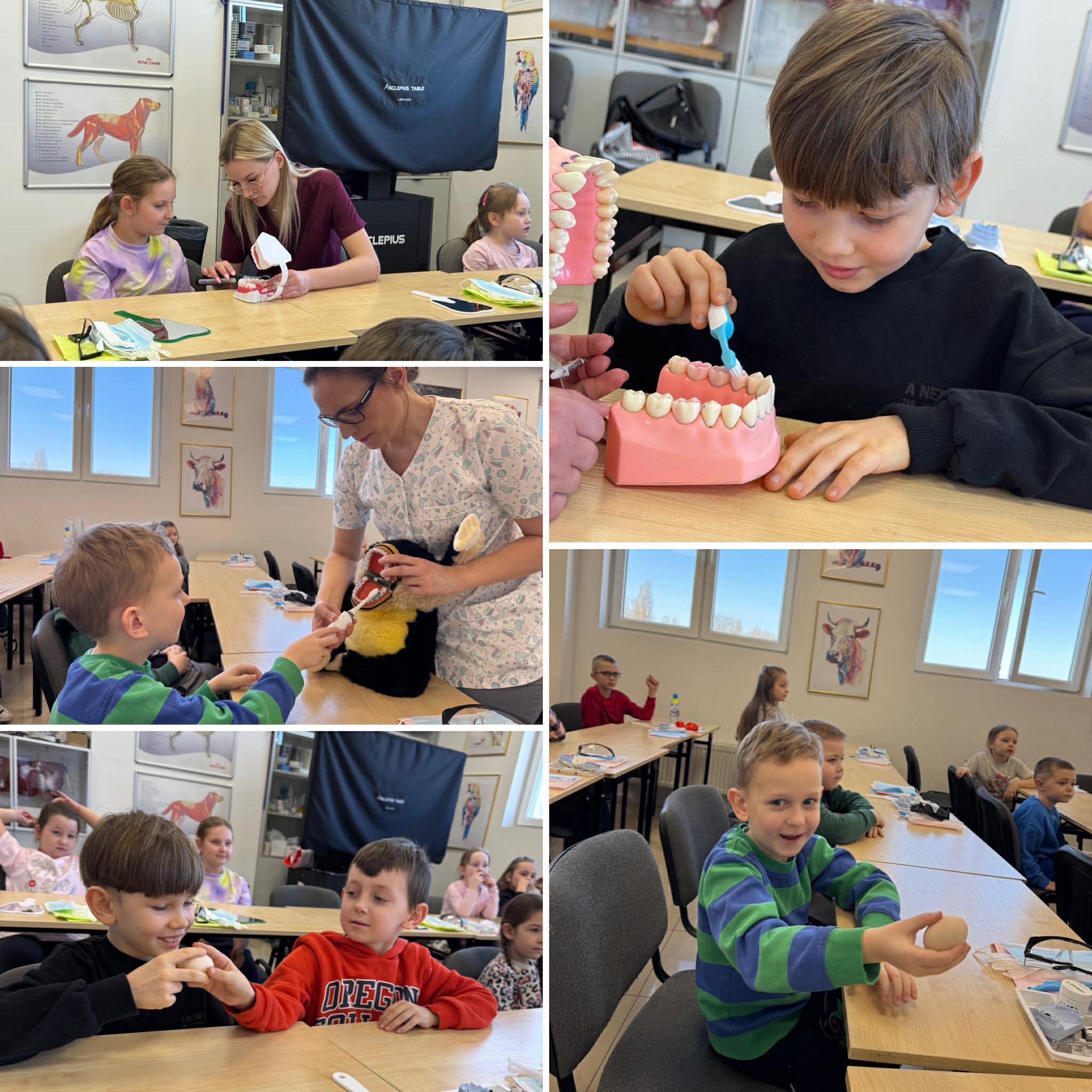 W piątek 6 marca 2026 roku dzieci z oddziału przedszkolnego udały się na zajęcia do Publicznej Policealnej Szkoły w Płońsku. Uczestniczyły w bardzo ciekawych zajęciach, podczas których dowiedziały się, co jest zdrowe i niezdrowe dla ząbków, jak należy o nie dbać i jak szczotkować. Obserwowały doświadczenie działania gazowanego słodzonego napoju na kredę z pastą do zębów na niej lub bez niej. Miały okazję dotknąć jajko, na które wcześniej działał ocet i co stało się ze z jego skorupką. Miały okazję sprawdzić, czy fotel dentystyczny jest wygodny oraz obejrzeć swoje ząbki na ekranie monitora. Ubrane w odpowiedni strój do pracy, uzupełniały model szczęki z ubytkami używając specjalnej masy i dentystycznych narzędzi. To były bardzo ciekawe zajęcia, za które dzieci bardzo dziękują. W podziękowaniu przygotowały kolekcję wesołych ząbków i laurkę dla Pani Moniki i jej asystentek. To były bardzo ciekawe zajęcia. Za udział w nich dzieci dostały dyplom, kolorowankę, długopis z ząbkiem oraz pojemniczek na ząbek. Dziękujemy.