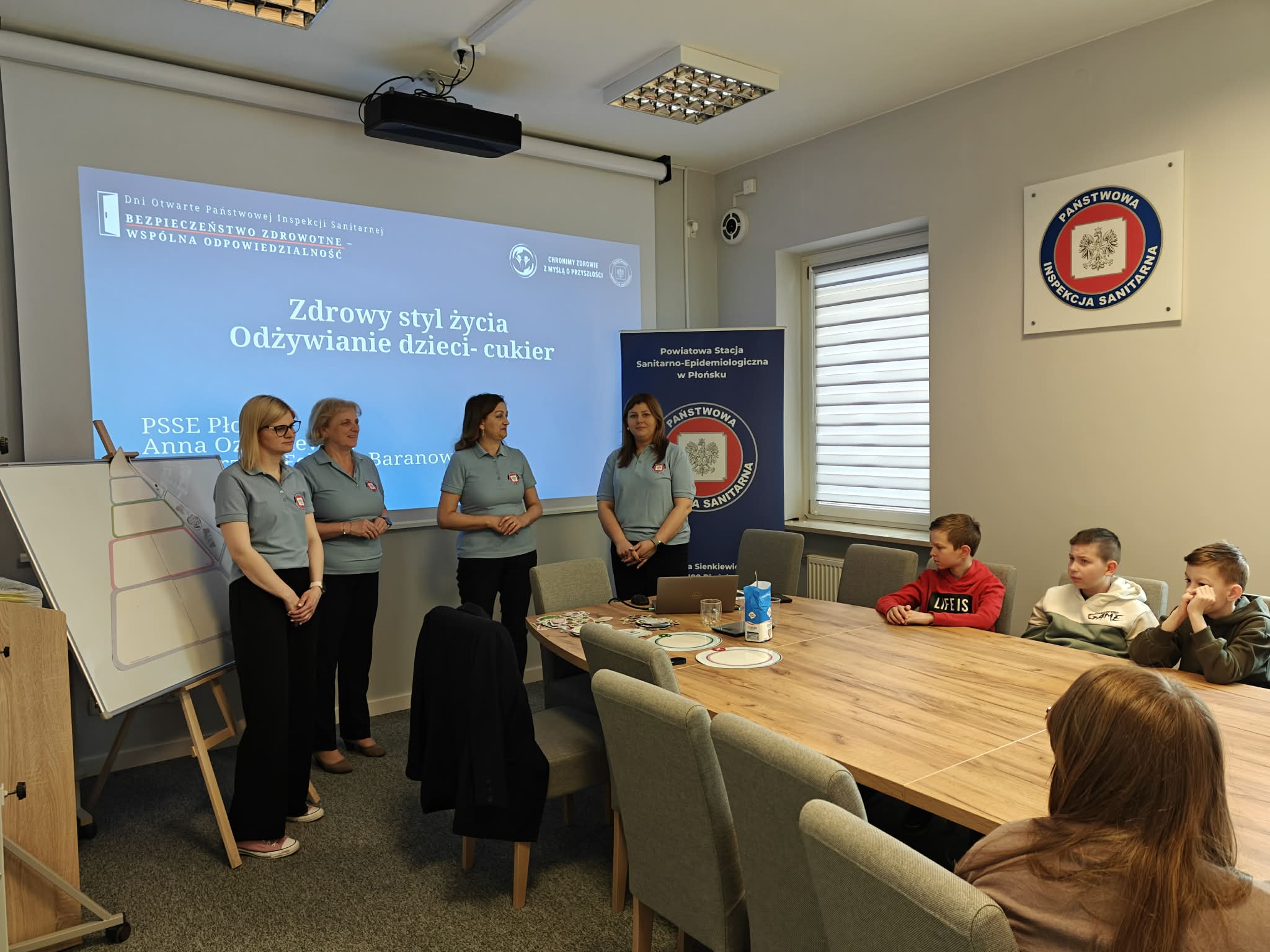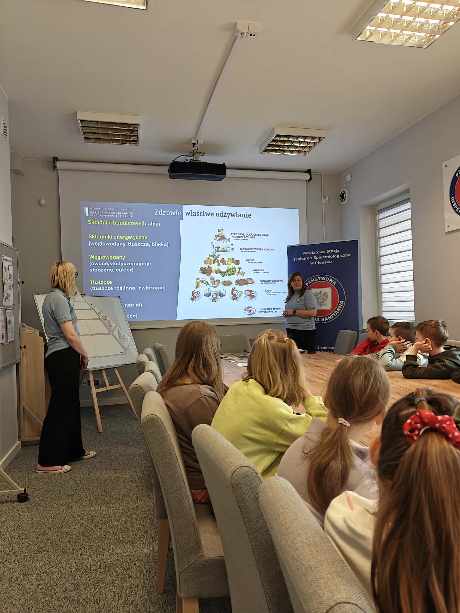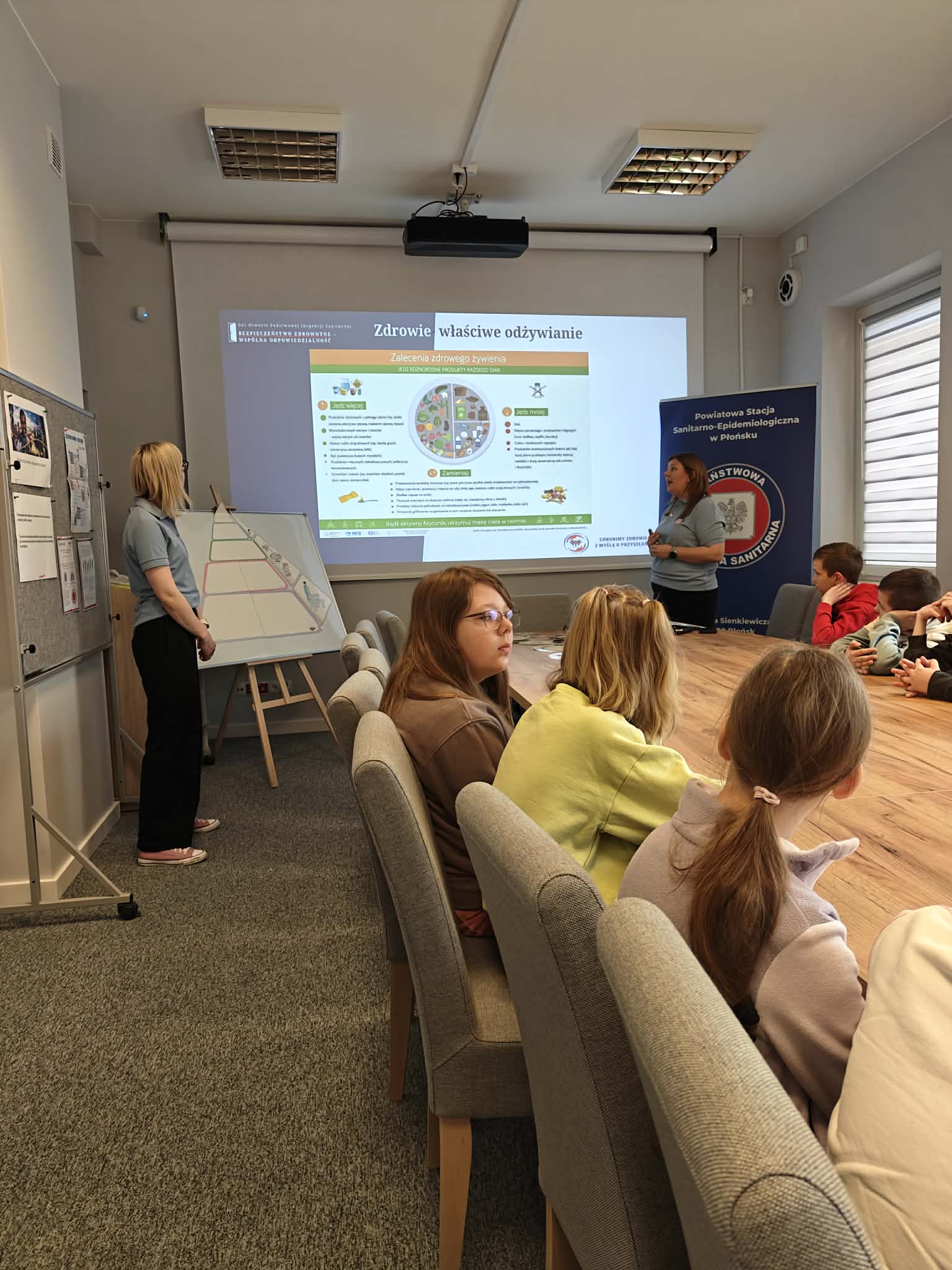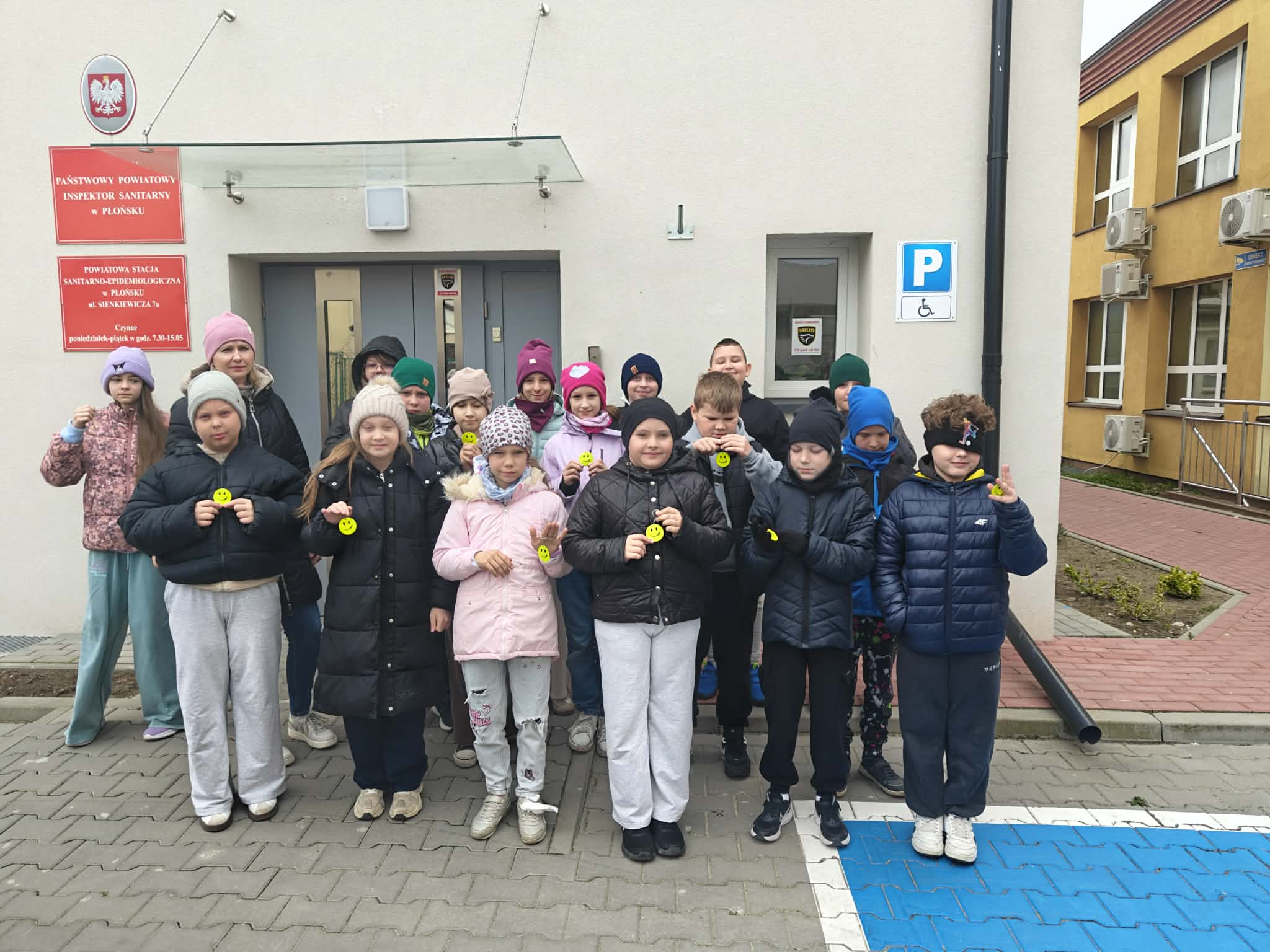 8 kwietnia 2026 r. uczniowie klasy 3 e razem z nauczycielami zostali zaproszeni do Powiatowej Stacji Sanitarno – Epidemiologicznej w Płońsku. Celem wizyty było wysłuchanie prelekcji na temat czynników wpływających na dobrostan naszego organizmu, skutków spożywania przetworzonej żywności i słodyczy. Trzecioklasiści wzięli także udział w warsztatach, podczas których układali piramidę zdrowego odżywiania. Komponowali talerz składający się ze zdrowych produktów spożywczych. Sprawdzali zawartość cukru w popularnych napojach, słodyczach, jogurtach poprzez odmierzanie go na wadze kuchennej. Rozwiązali test sprawdzający wiedzę z zakresu odżywiania i zagadki dotyczące higieny ciała. Uczniowie wrócili do szkoły z dawką wiedzy, która przyczyni się do świadomego, a przede wszystkim zdrowego przygotowywania posiłków. To była wartościowa i potrzebna lekcja przeprowadzona w miłej atmosferze. Dziękujemy Paniom za przekazanie nam wielu ważnych i bezcennych informacji. Dzięki nim możemy świadomie zadbać o nasze zdrowie, które zaczyna się na talerzu.