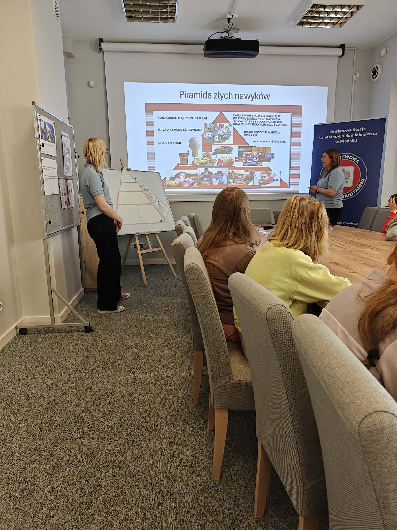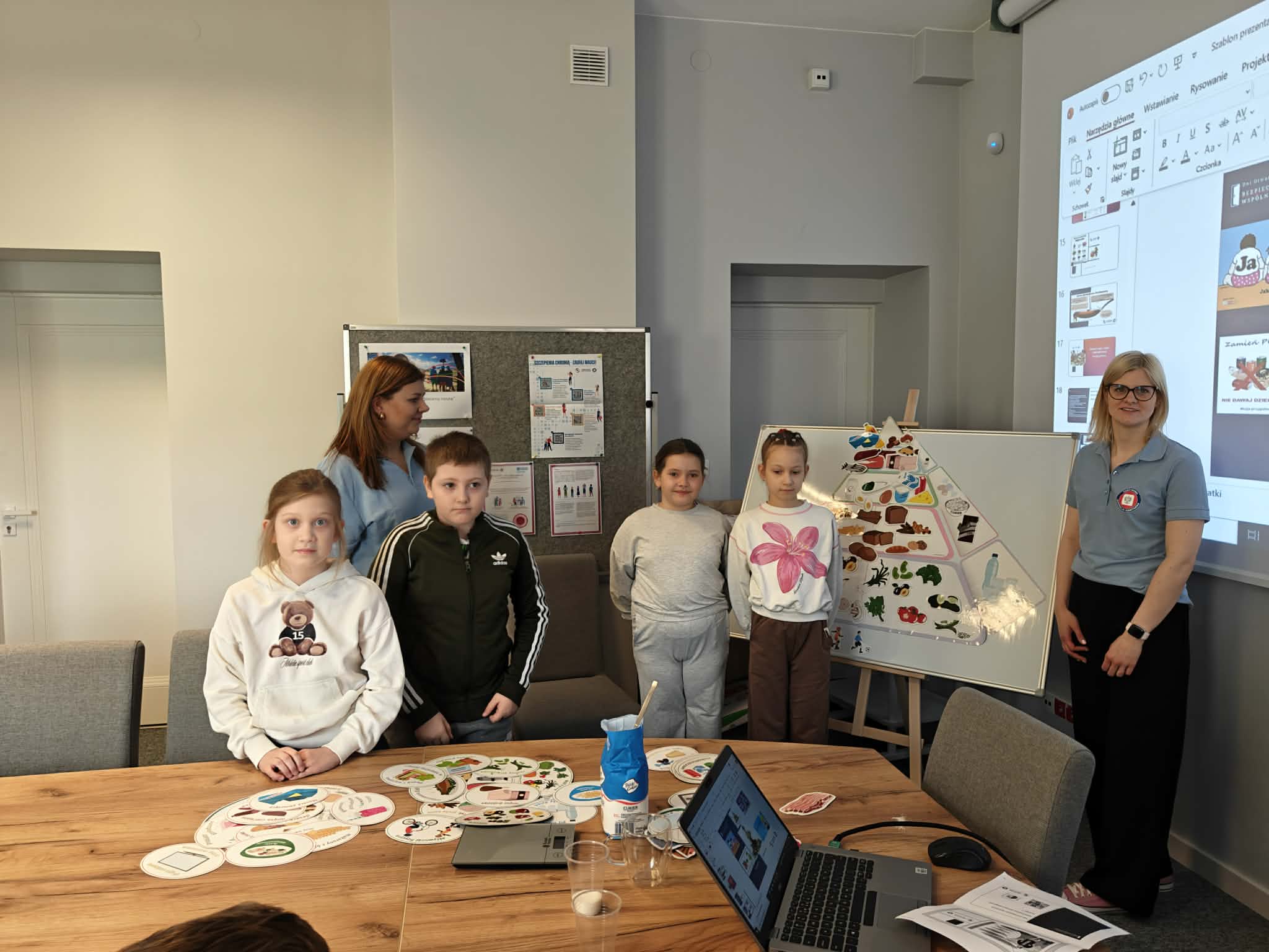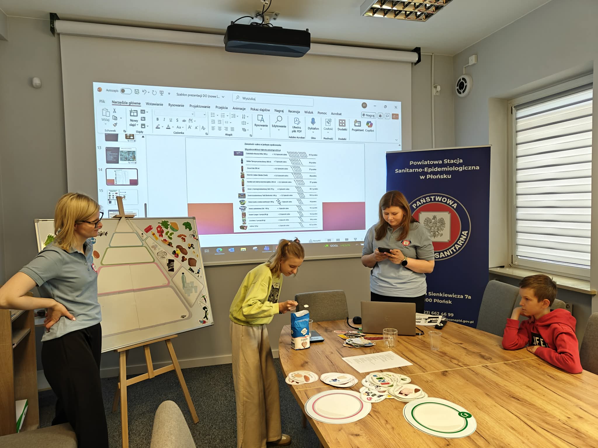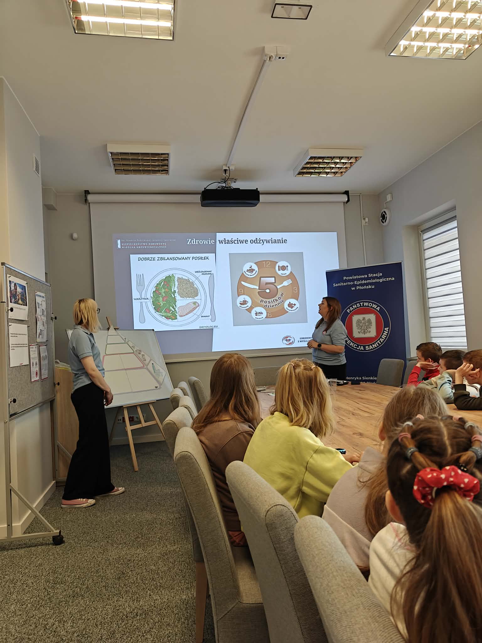 8 kwietnia 2026 r. uczniowie klasy 3 e razem z nauczycielami zostali zaproszeni do Powiatowej Stacji Sanitarno – Epidemiologicznej w Płońsku. Celem wizyty było wysłuchanie prelekcji na temat czynników wpływających na dobrostan naszego organizmu, skutków spożywania przetworzonej żywności i słodyczy. Trzecioklasiści wzięli także udział w warsztatach, podczas których układali piramidę zdrowego odżywiania. Komponowali talerz składający się ze zdrowych produktów spożywczych. Sprawdzali zawartość cukru w popularnych napojach, słodyczach, jogurtach poprzez odmierzanie go na wadze kuchennej. Rozwiązali test sprawdzający wiedzę z zakresu odżywiania i zagadki dotyczące higieny ciała. Uczniowie wrócili do szkoły z dawką wiedzy, która przyczyni się do świadomego, a przede wszystkim zdrowego przygotowywania posiłków. To była wartościowa i potrzebna lekcja przeprowadzona w miłej atmosferze. Dziękujemy Paniom za przekazanie nam wielu ważnych i bezcennych informacji. Dzięki nim możemy świadomie zadbać o nasze zdrowie, które zaczyna się na talerzu.