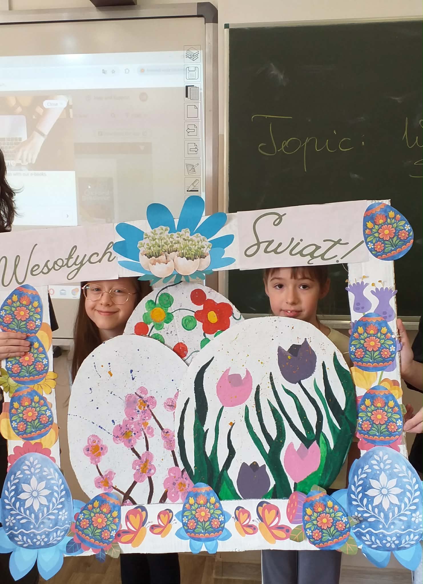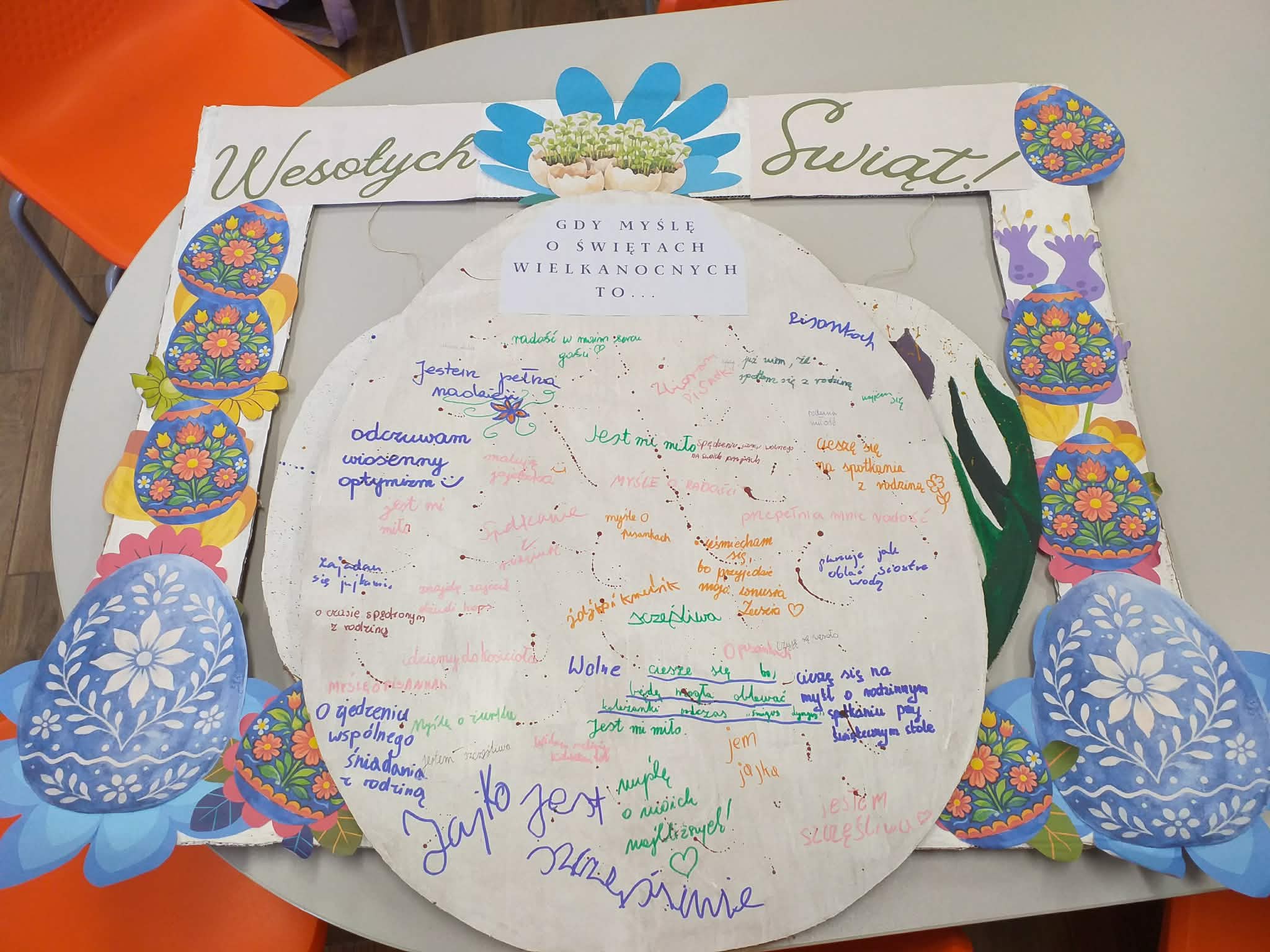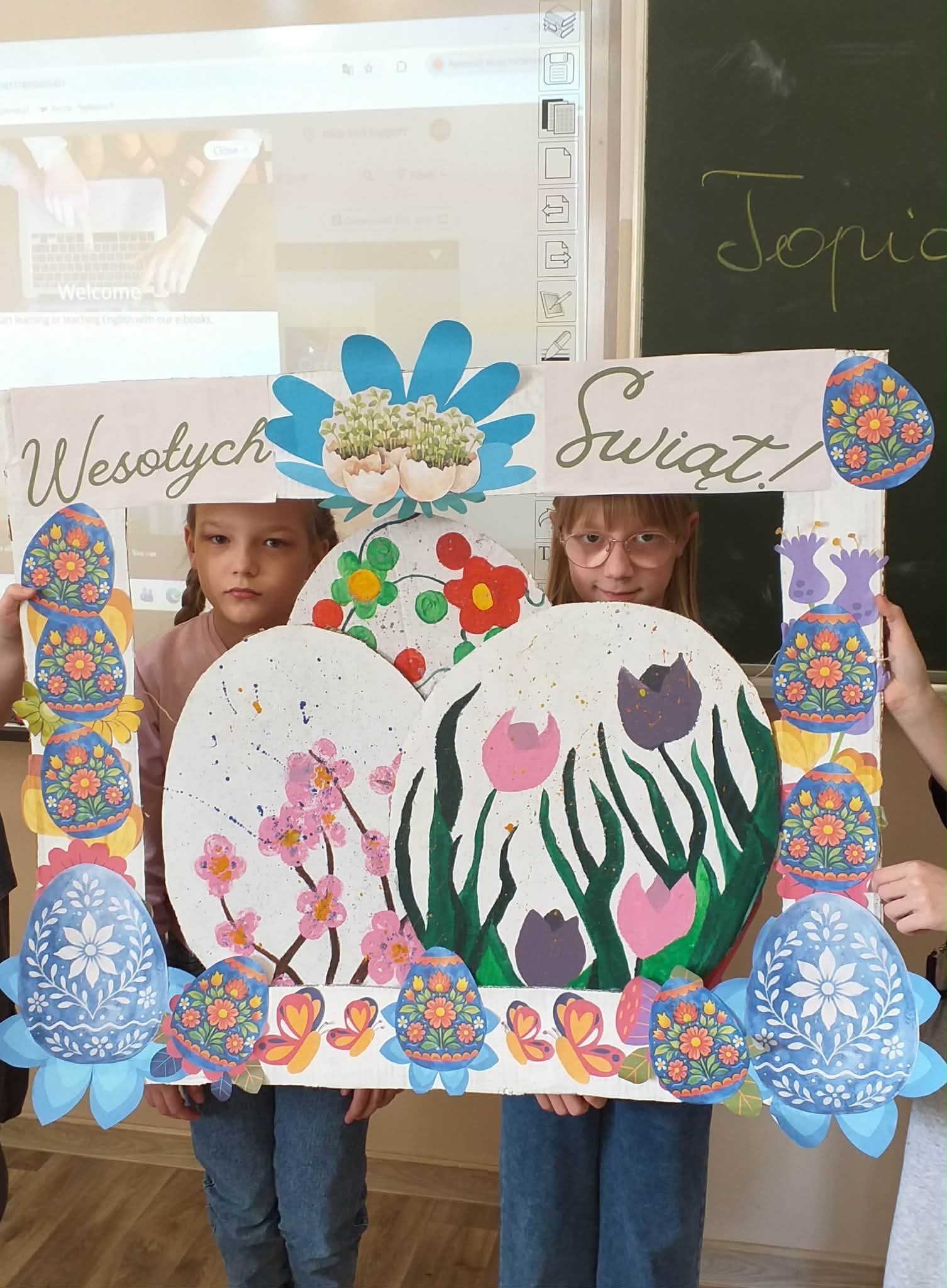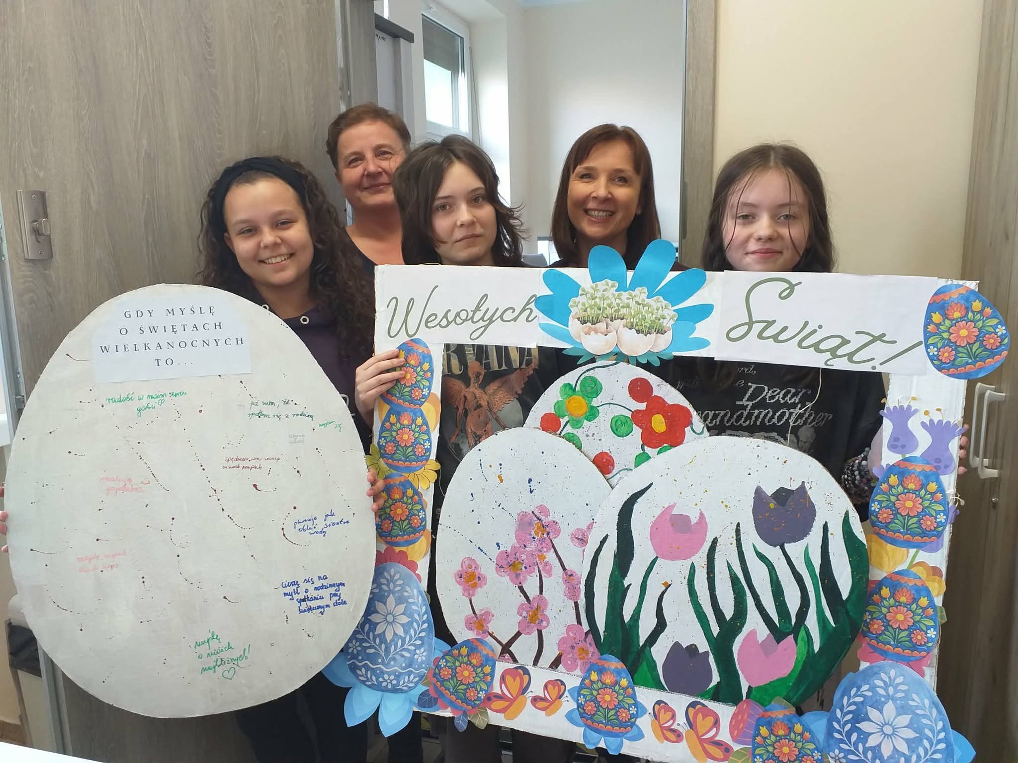 Uczennice z klasy 6a Lena Burcz, Natalia Jackiewicz, Natalia Mackiewicz, we współpracy z biblioteką szkolną, przygotowały wyjątkową dekorację wielkanocną, która wprowadza całą społeczność szkolną w świąteczny nastrój. Jednym z elementów tej inicjatywy była tablica, na której nauczyciele i uczniowie mogli dokończyć zdanie: „Gdy myślę o Świętach Wielkanocnych to…”. Pojawiające się odpowiedzi najczęściej nawiązywały do spotkań rodzinnych, bliskości najbliższych oraz poczucia szczęścia i radości. Biblioteka szkolna serdecznie zaprasza do obejrzenia wystawy przygotowanej w ramach tej akcji i wspólnego przeżywania atmosfery zbliżających się świąt.