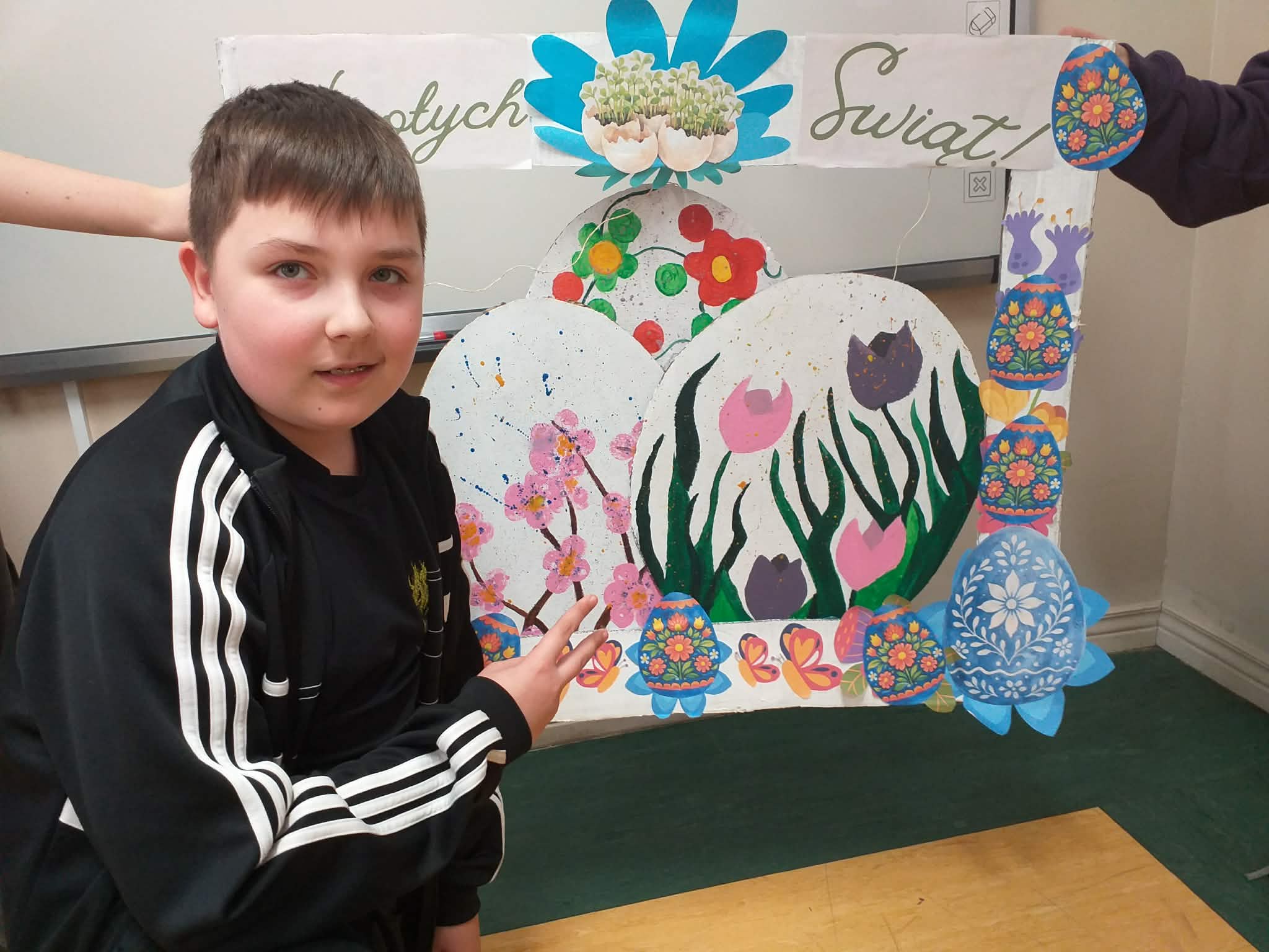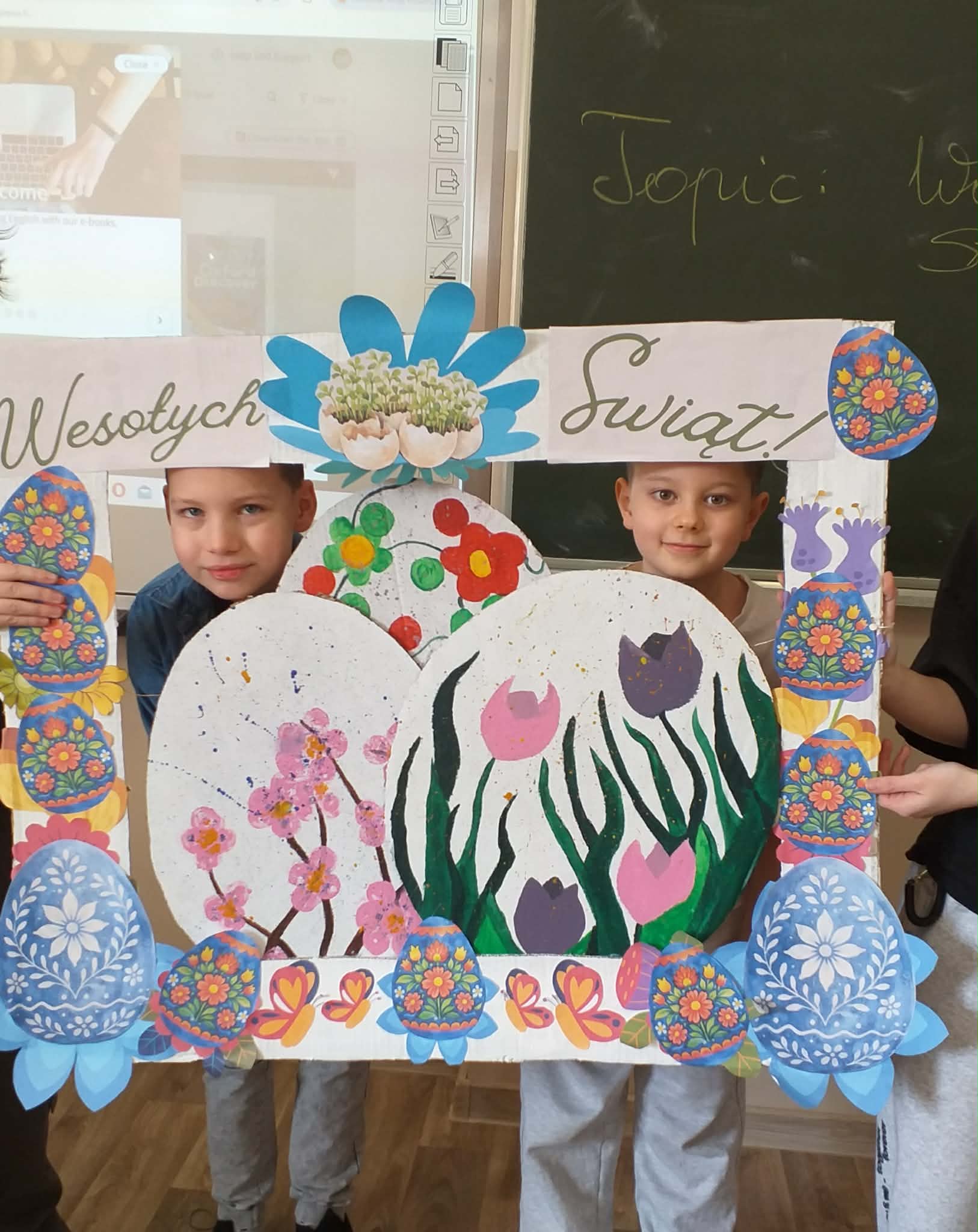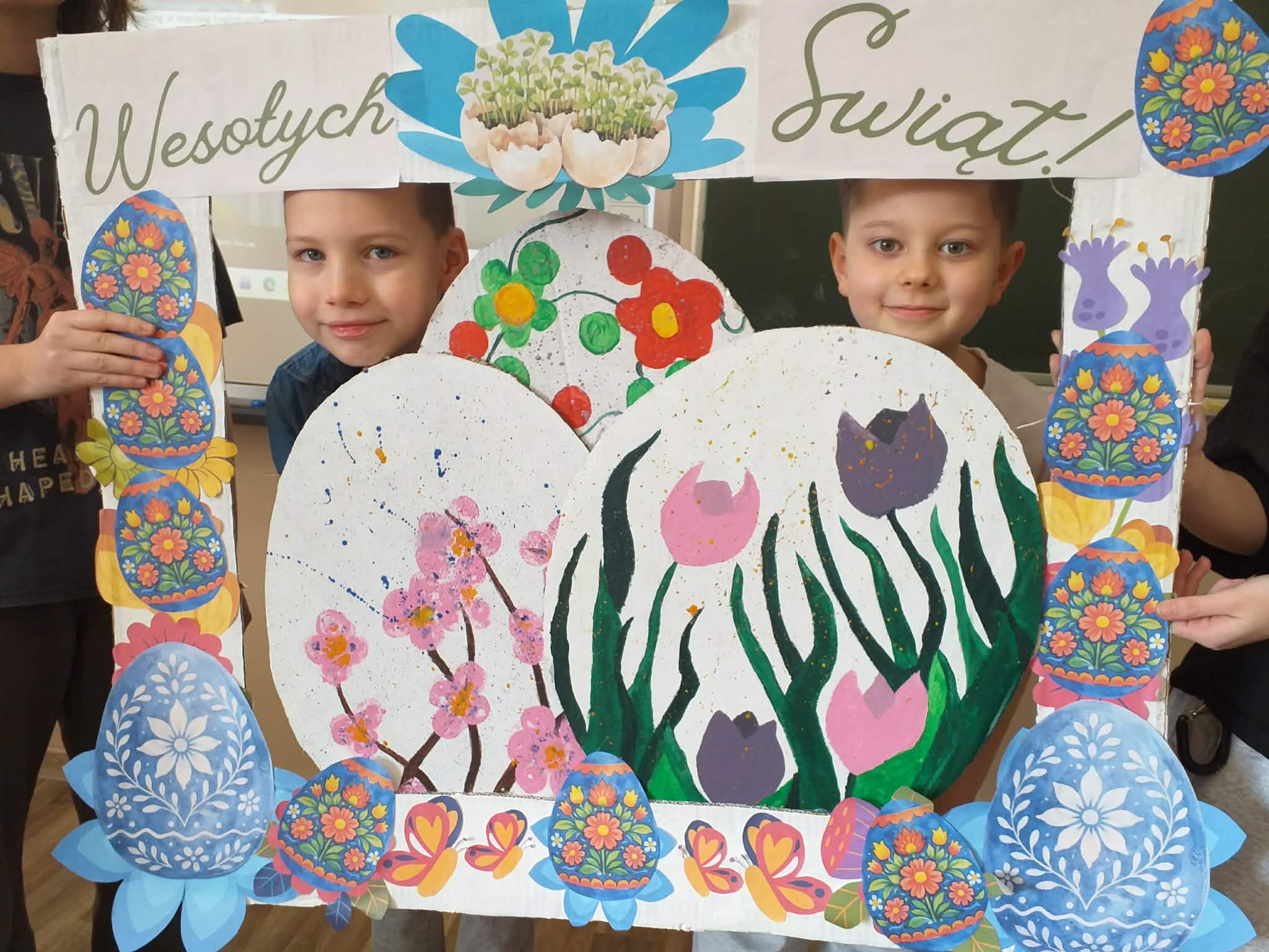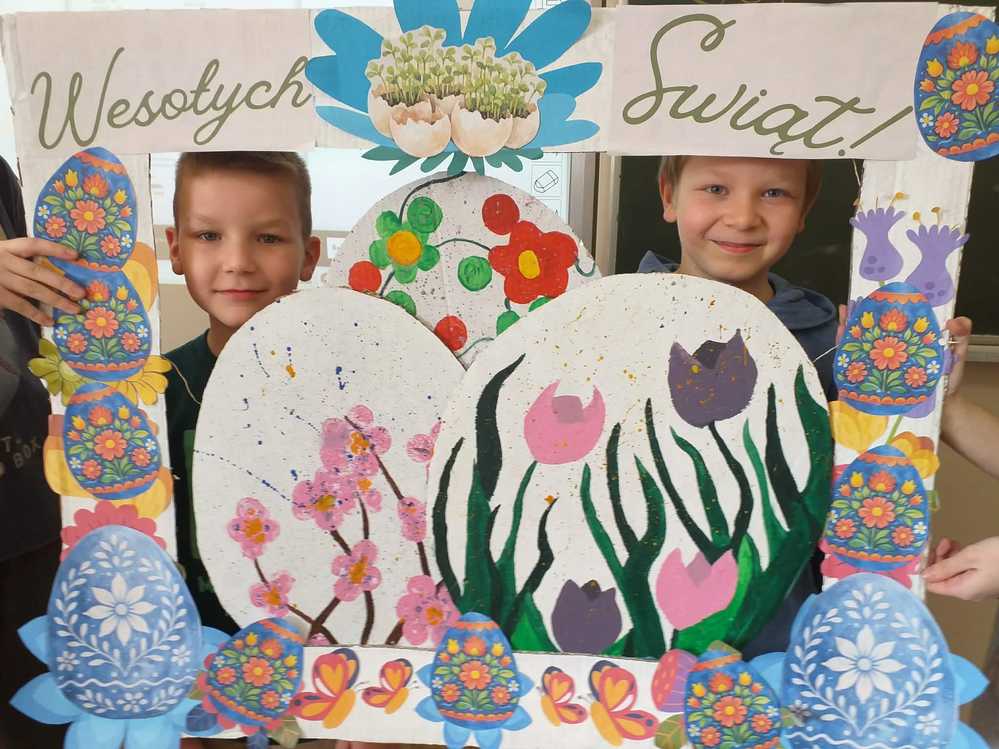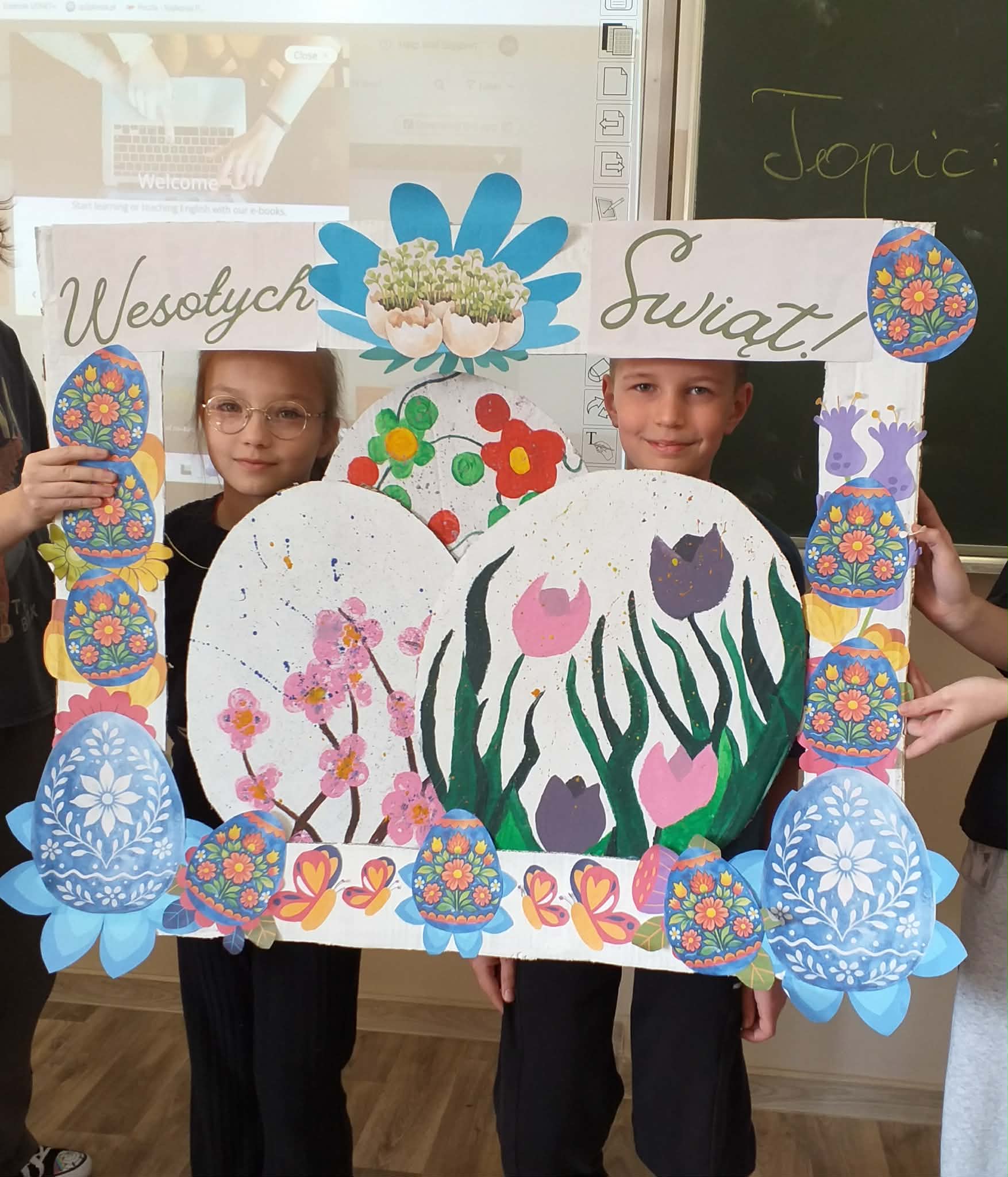 Uczennice z klasy 6a Lena Burcz, Natalia Jackiewicz, Natalia Mackiewicz, we współpracy z biblioteką szkolną, przygotowały wyjątkową dekorację wielkanocną, która wprowadza całą społeczność szkolną w świąteczny nastrój. Jednym z elementów tej inicjatywy była tablica, na której nauczyciele i uczniowie mogli dokończyć zdanie: „Gdy myślę o Świętach Wielkanocnych to…”. Pojawiające się odpowiedzi najczęściej nawiązywały do spotkań rodzinnych, bliskości najbliższych oraz poczucia szczęścia i radości. Biblioteka szkolna serdecznie zaprasza do obejrzenia wystawy przygotowanej w ramach tej akcji i wspólnego przeżywania atmosfery zbliżających się świąt.